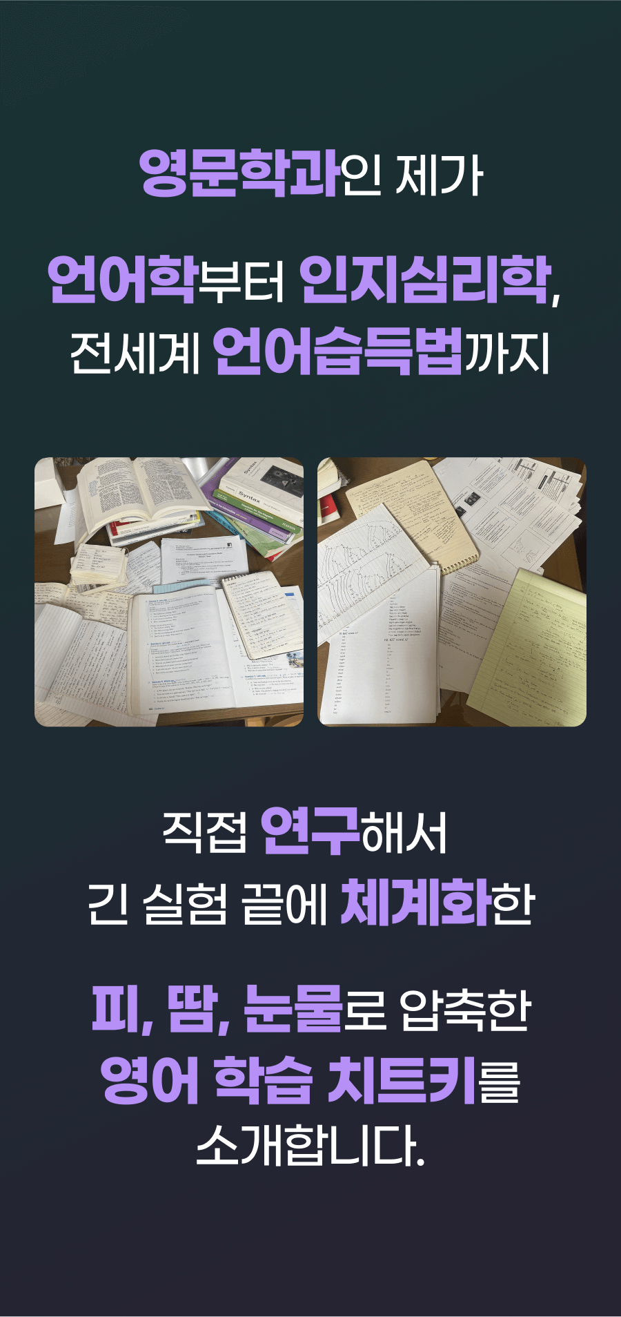 그때부터 저는 한국의 ESL 학생들이 겪는 어려움에 주목했습니다. 영어를 전공했기 때문에 ESL (English as a second language) learner들이 어떤 방식으로 영어를 받아들이는지에 대한 매커니즘은 빠삭하게 알고 있었고, 발달심리학, 인지심리학, 교수법 등 다양한 분야의 이론들을 탐구하고 미친듯이 논문, 아티클, 저널들을 읽기 시작했습니다. '원어민이 영어를 배우는 원리를 한국인도 동일하게 적용할 수 있지 않을까?’라고 막연하게 생각했던 것이 연구와 검증을 거치며 실현 가능해 보였어요!