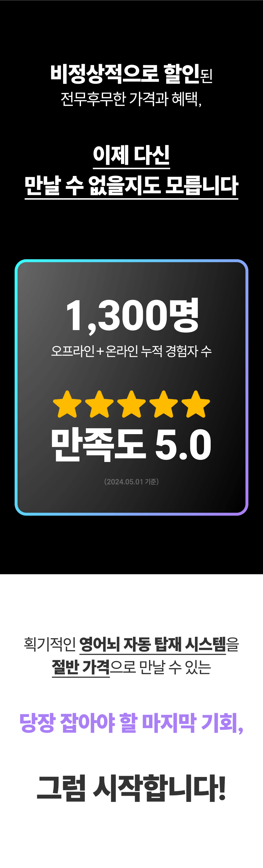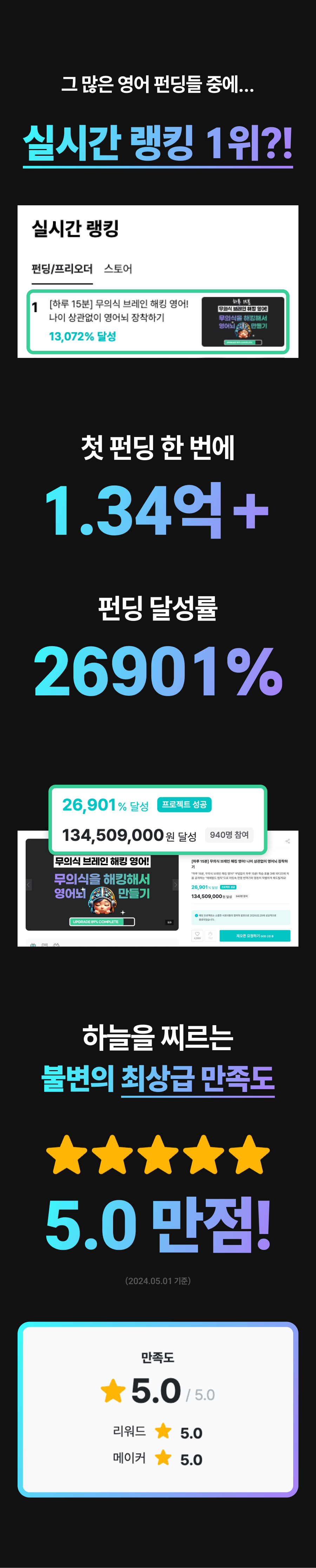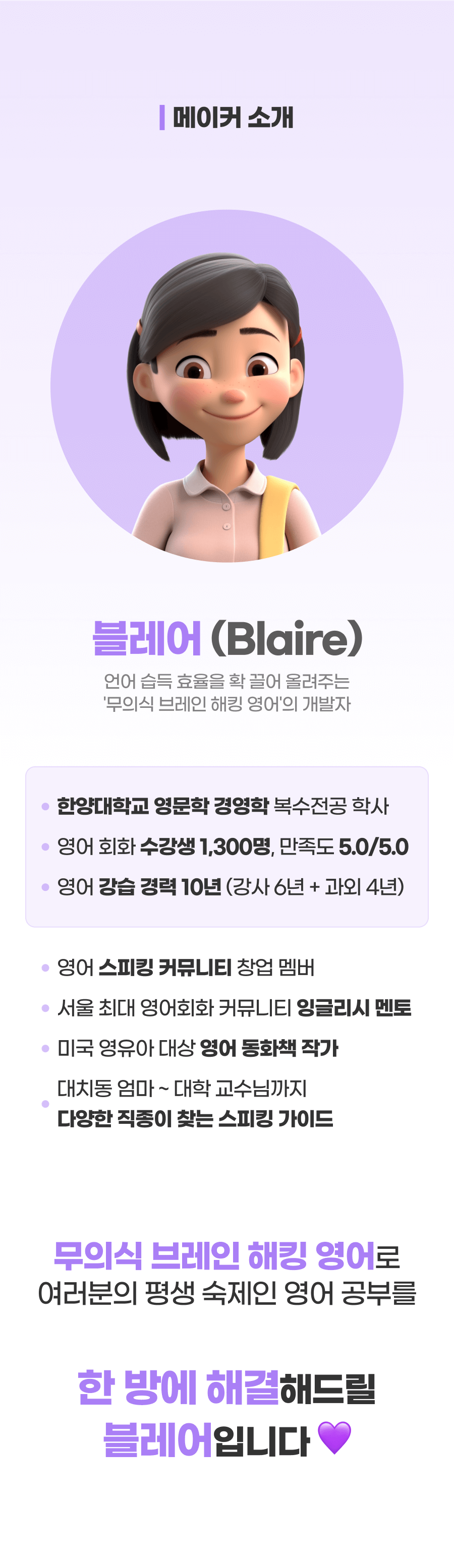 이제 저는 이 혁신적인 '무의식 영어 학습법'을 더 넓은 세상에 소개하고 싶습니다. 이 본 펀딩 프로젝트는 단순하게 교육 콘텐츠를 판매하는 것이 아닙니다. 제 열정과 수강생들의 성공 이야기를 통해 많은 이들에게 영어 학습에 대한 새로운 희망과 가능성을 제시하는 프로젝트예요. '무의식 영어 학습법'이라는 혁신적인 방법을 통해, 더 많은 사람들이 영어 회화의 장벽을 넘어 자신감을 얻고, 새로운 세계를 경험할 수 있도록 돕고 싶습니다. 이것이 제가 이 프로젝트에 열정을 쏟는 이유이자, 블레어 프로젝트의 핵심 메시지입니다.