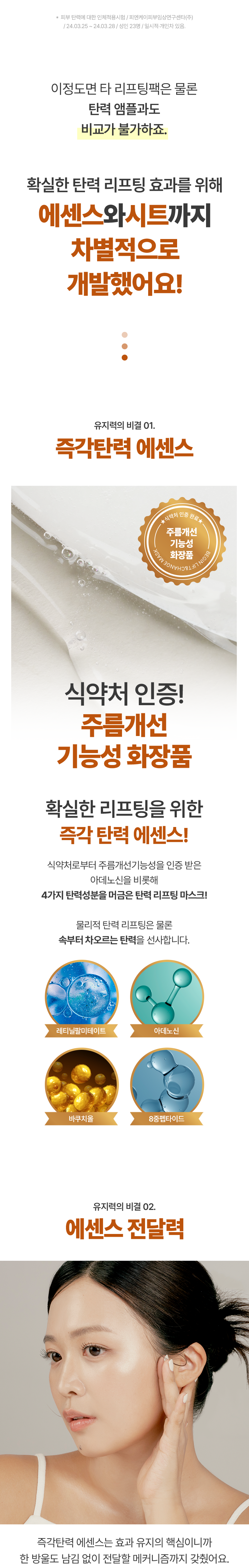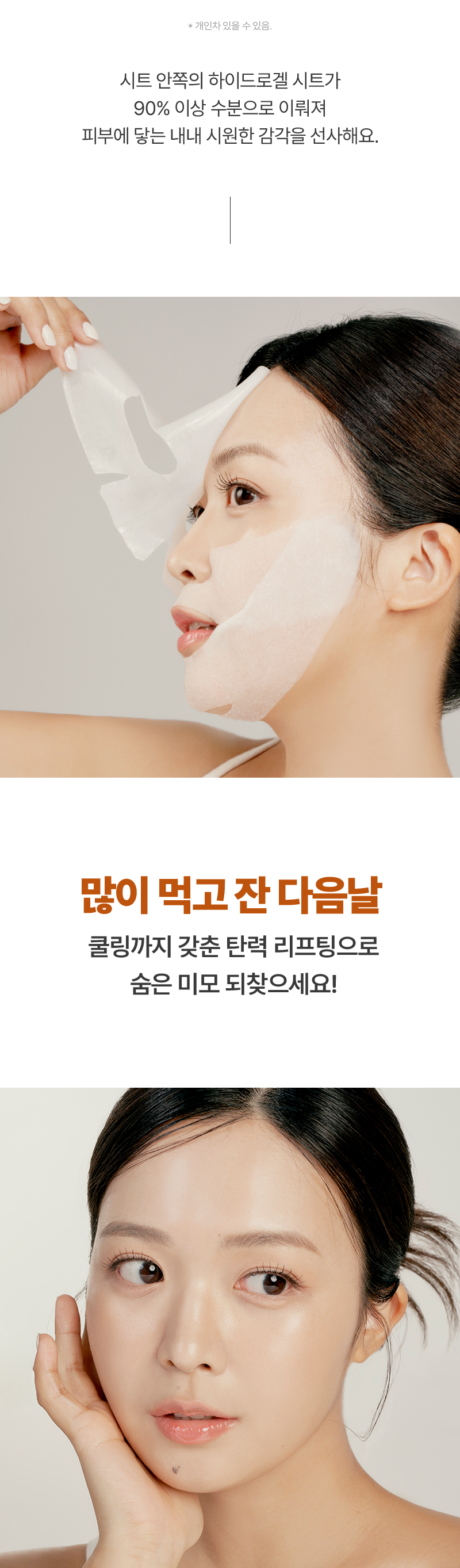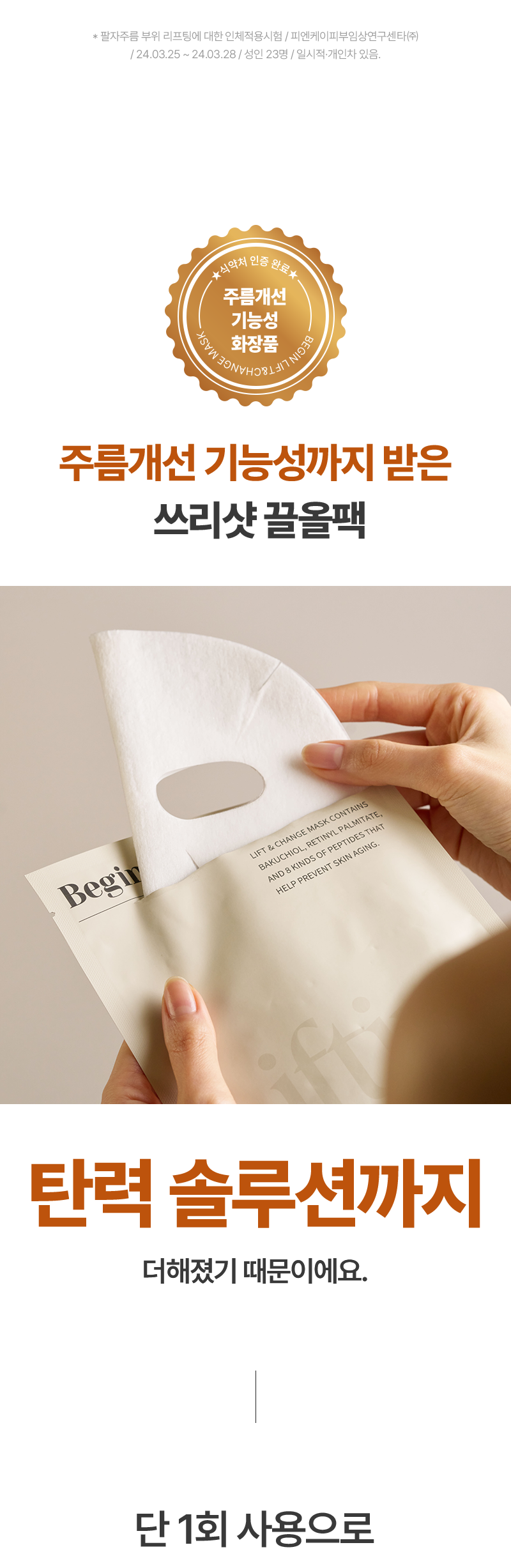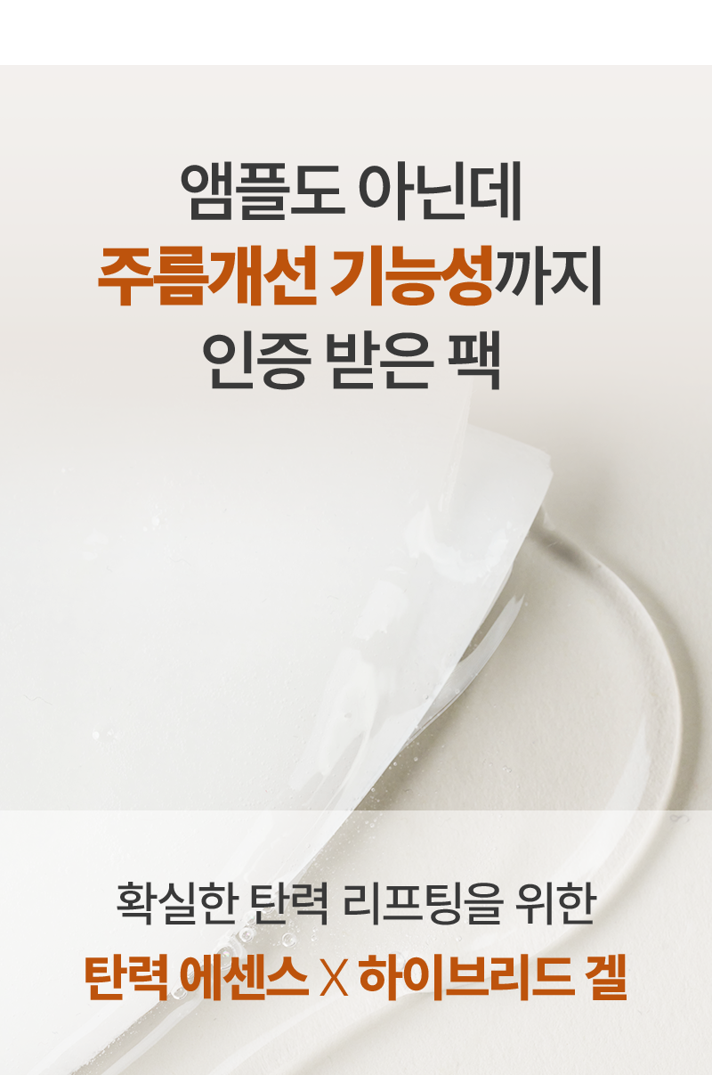 그렇지만 달성했습니다. 그것도 유지력 89.9%로요. 앰플도 아닌데 식약처에서 주름개선 기능성까지 인증 받았고요.모든 효능은 원료에서 나오니까 고가 브랜드에서나 쓰는 강력한 안티에이징 원료는 다 넣었거든요. 화장품의 품질은 판매자의 욕심을 경계하며 장기적인 수익을 추구하면 절로 올라가기 마련입니다. 결국엔 탄력이 받춰줘야 리프팅도 유지된다는 걸 누구보다 통감하기에 탄력앰플도 못따라오는 마스크를 만들게 됐어요.