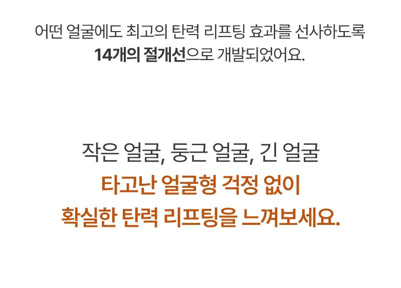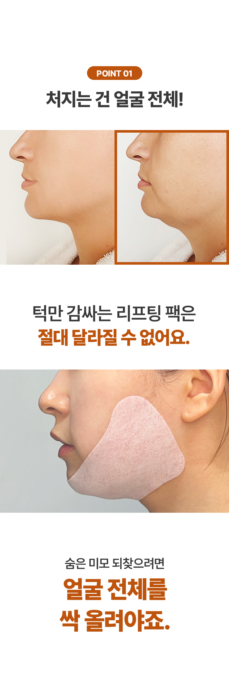 대부분의 리프팅 마스크는 턱살 올려주는데 집중되어 있는게 문제였어요.이건 근본적인 해결책이 될 수 없거든요. 팔자주름이 있다는 건 사실 얼굴 전체 탄력이 무너져 내려왔다는 거라 이마, 볼, 턱 모든 부위를 리프팅 시켜야 하니까요.