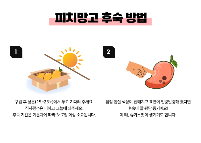 망고를 온도 차가 큰 베란다 혹은 다용도실과 같은 실외에 보관할 경우 제대로 후숙되지 않을 수 있으니 피해주세요.