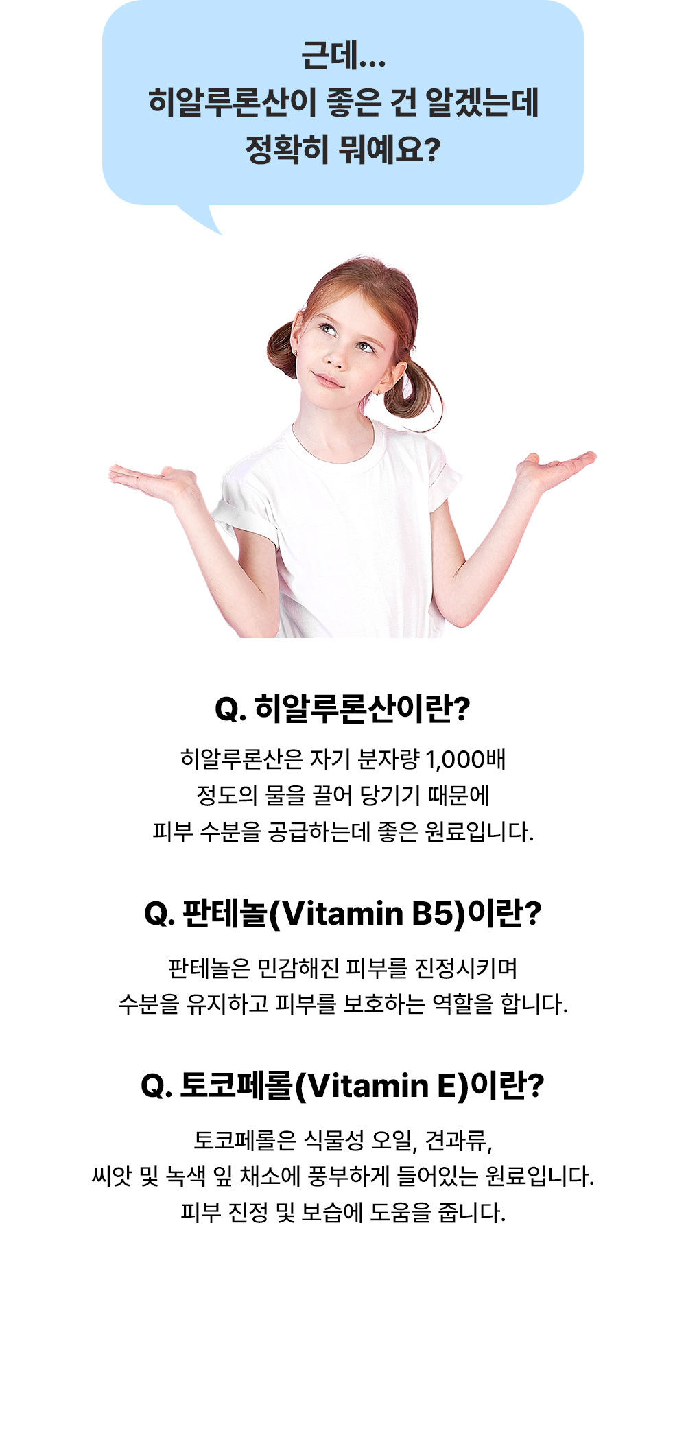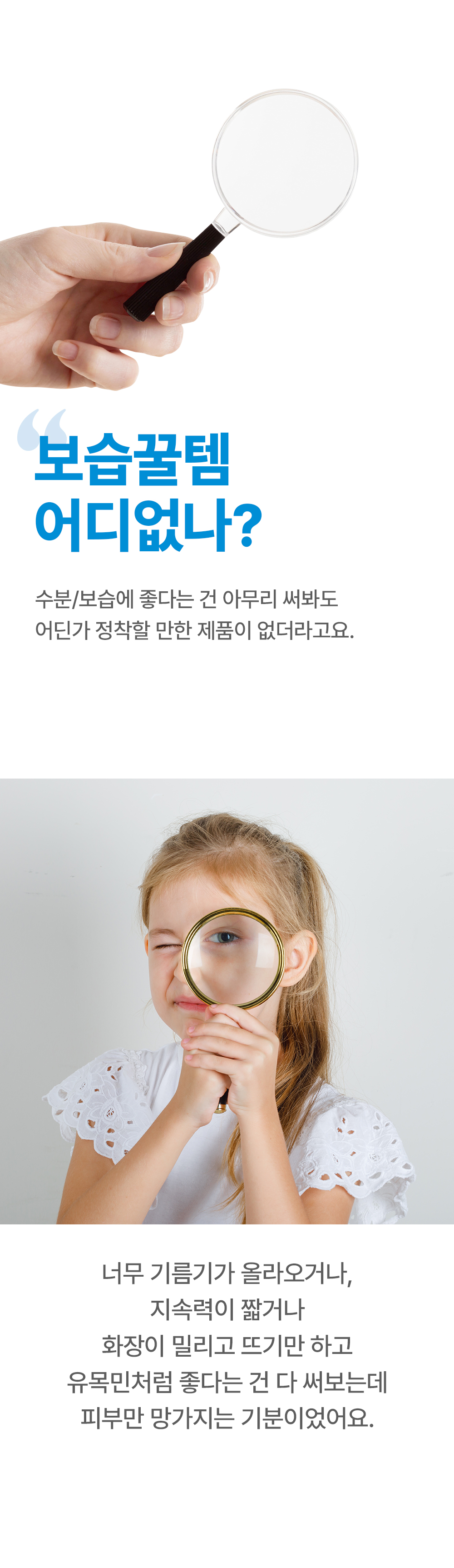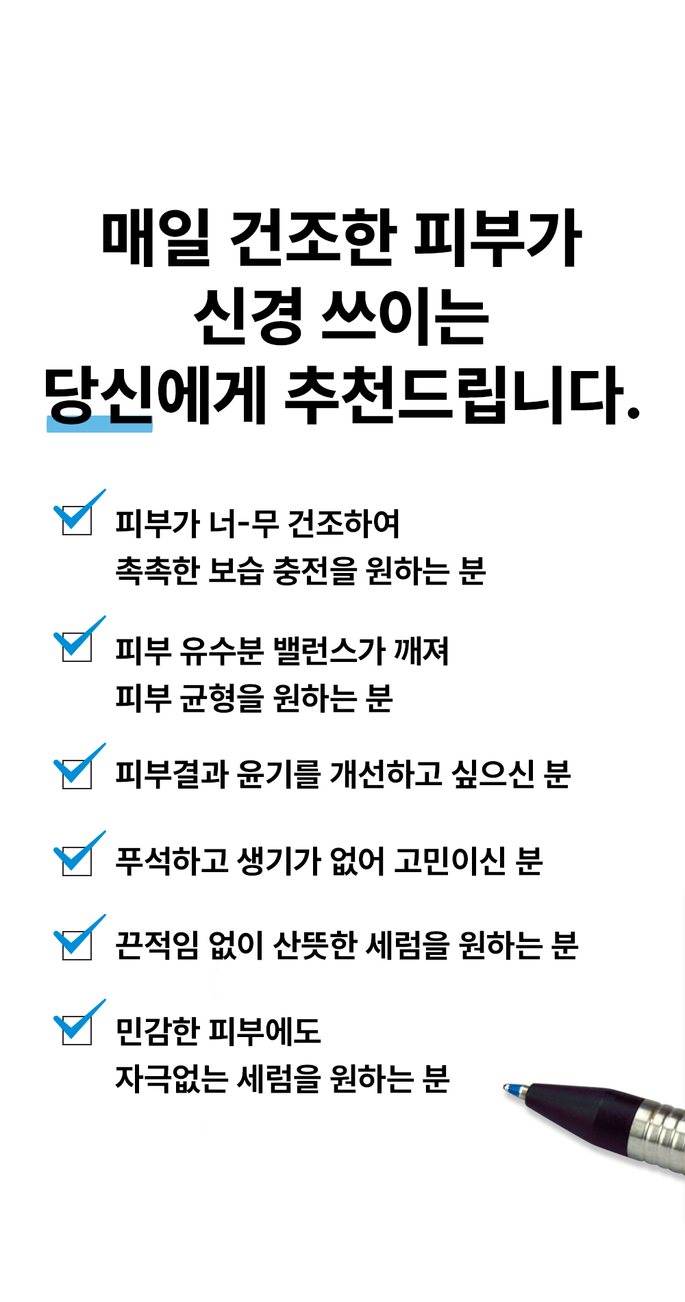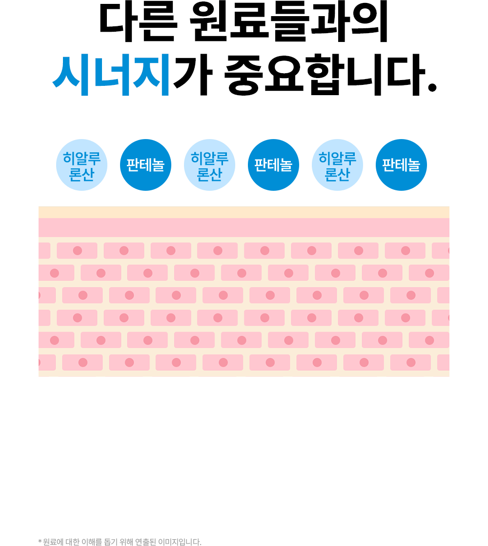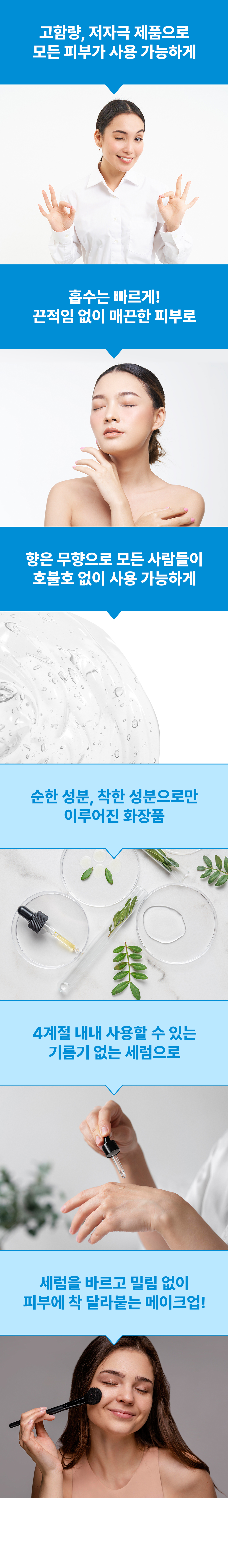 피부 타입 별 고민에 알맞은 가장 효과적인 원료를 엄선하여 고함량으로 담고, 메인 성분에 도움이 되는 최소한의 보조 성분만을 추가하여 자극없이 사용 가능한 최적의 배합을 연구하여 만들어낸 제품입니다.