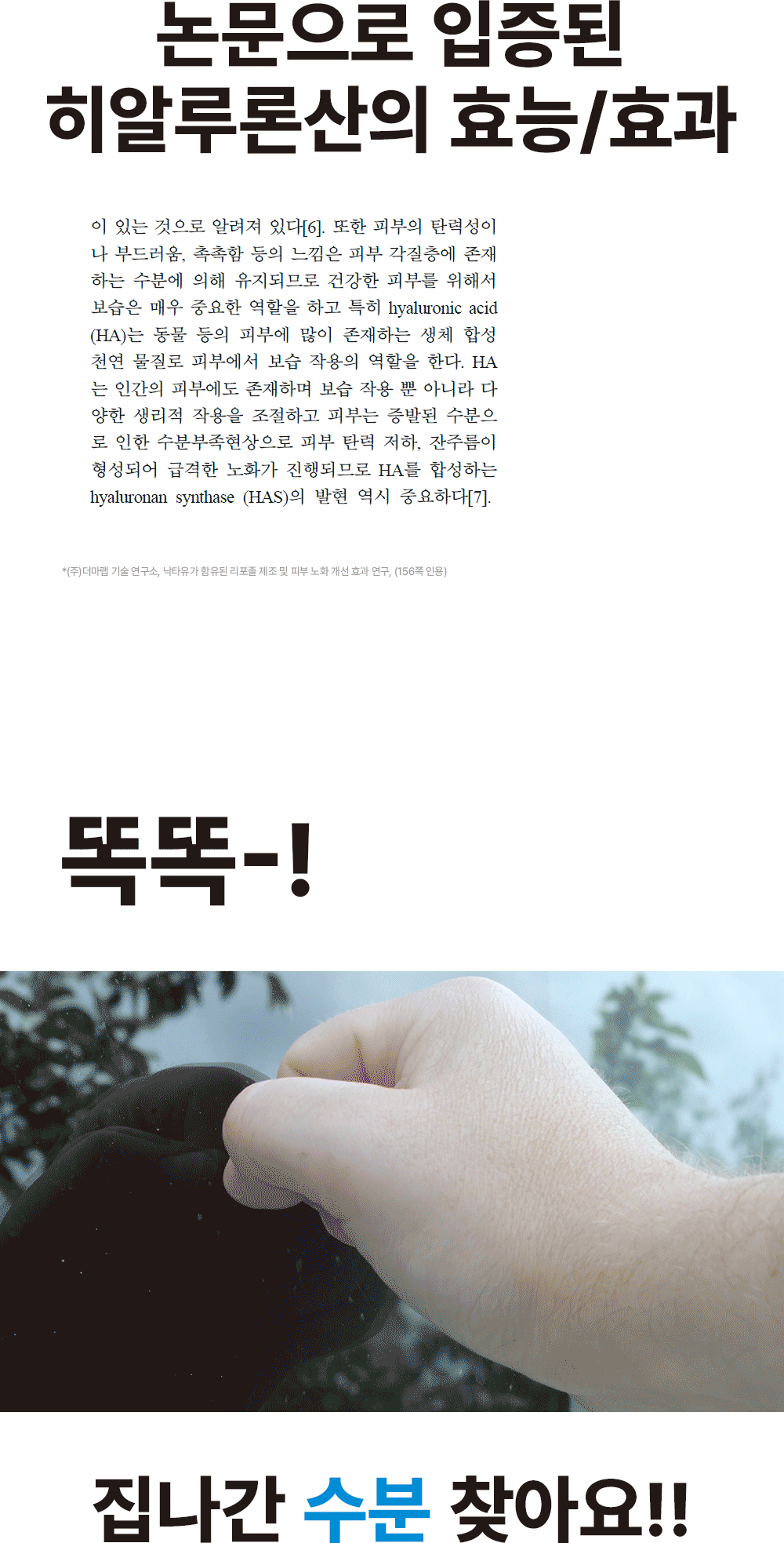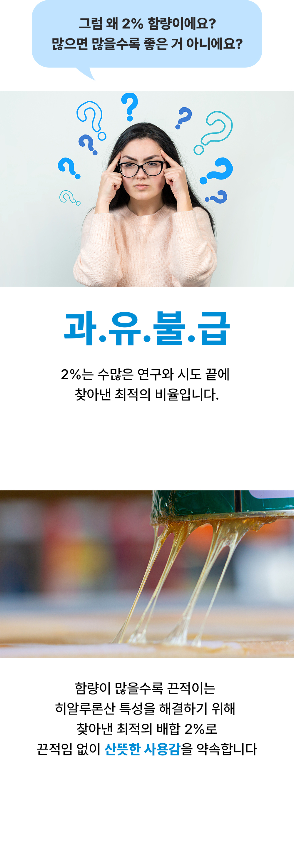 이번 와디즈 프리오더 프로젝트에서는 스킨케어의 가장 기본 단계인 수분 / 보습 충전에 탁월한 제품을 소개시켜드리고자 히알루론산 2퍼센트 세럼을 준비했습니다. 속건조, 보습 충전, 탄탄한 피부 장벽 등 수분 세럼 유목민이던 서포터님들께 도움이 되는 제품이기를 바라는 마음입니다.