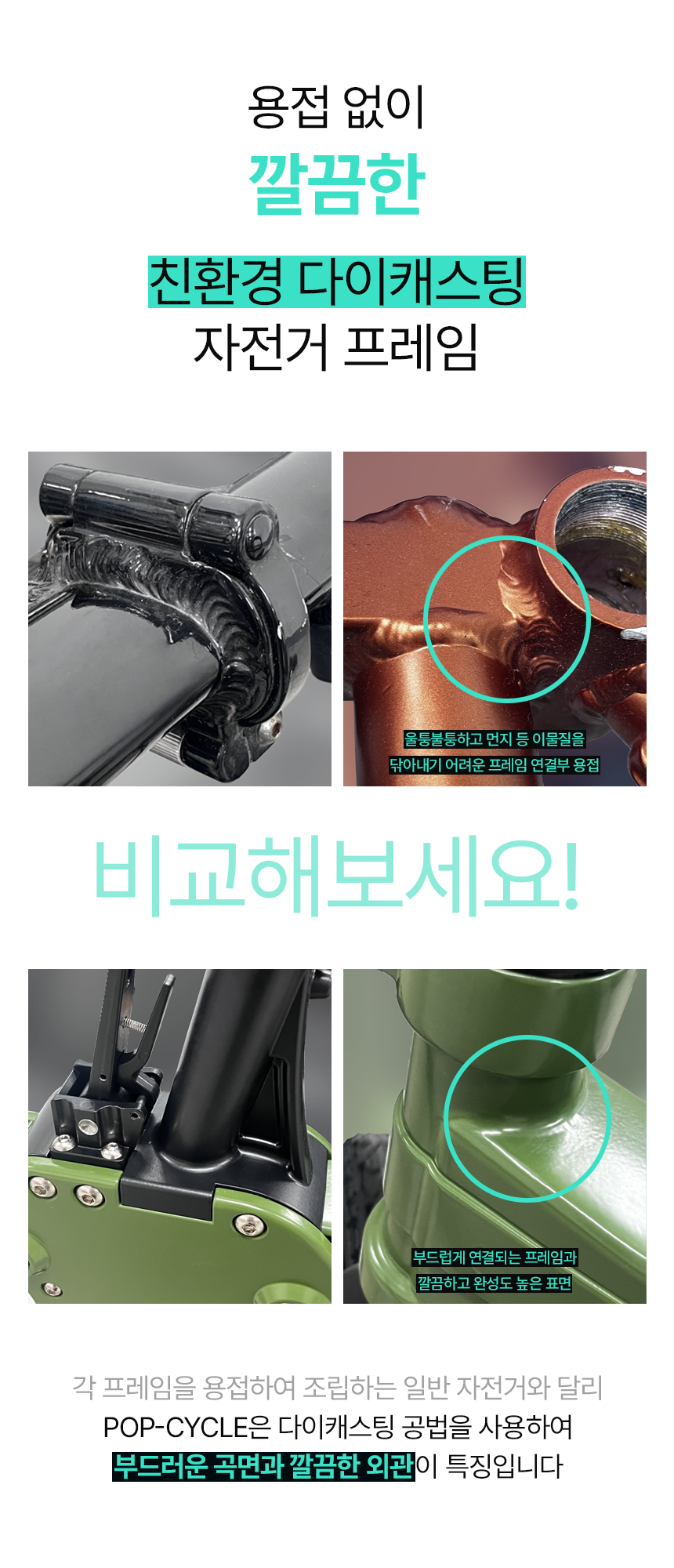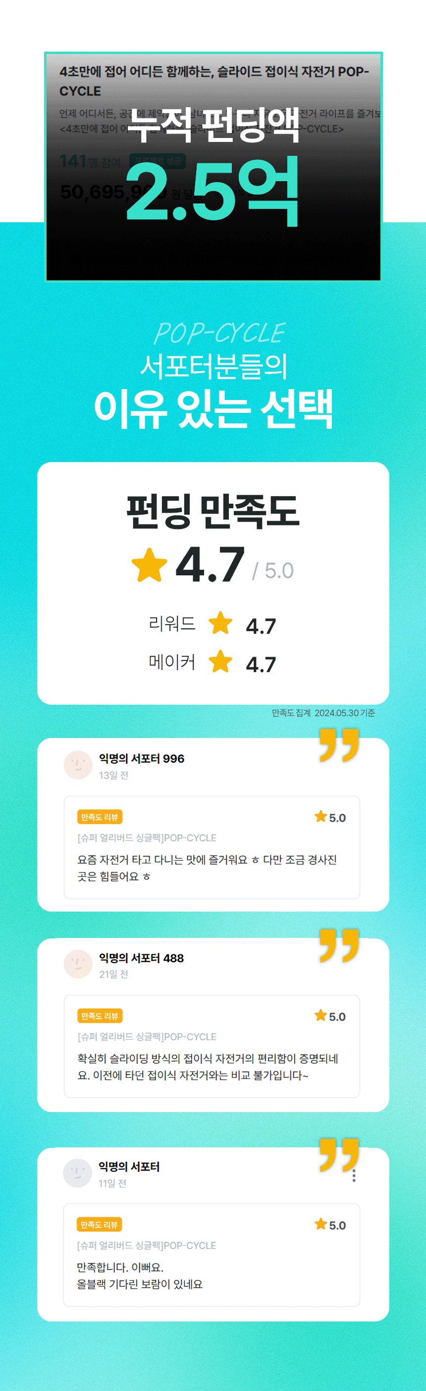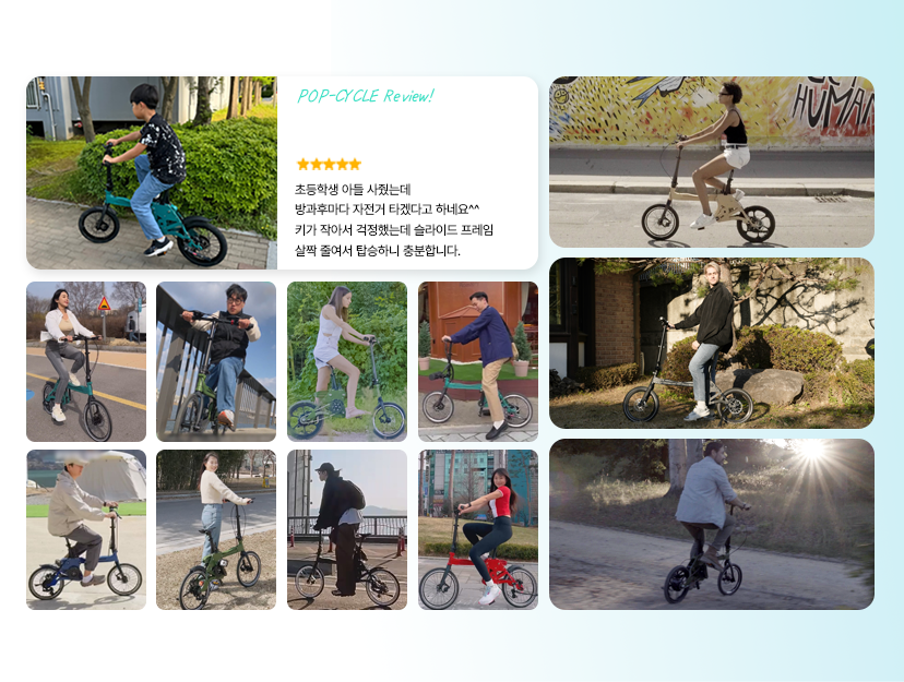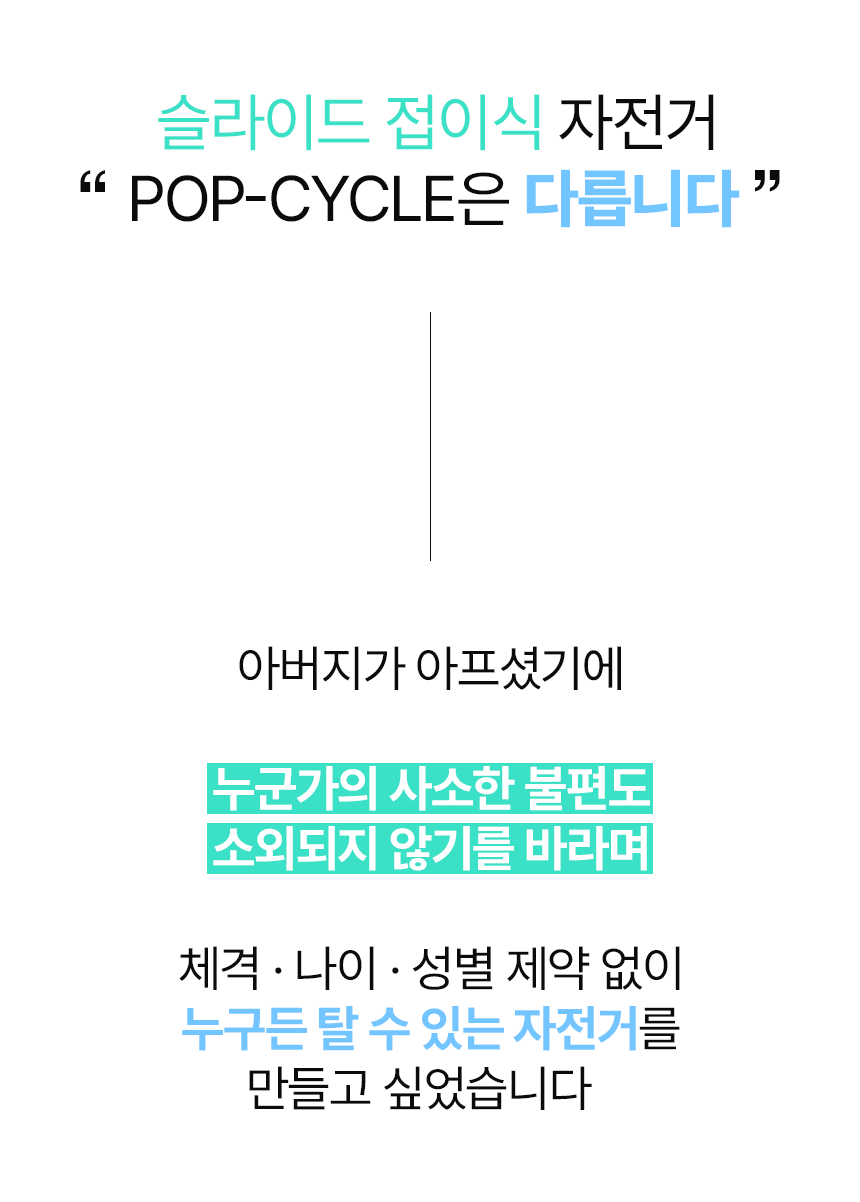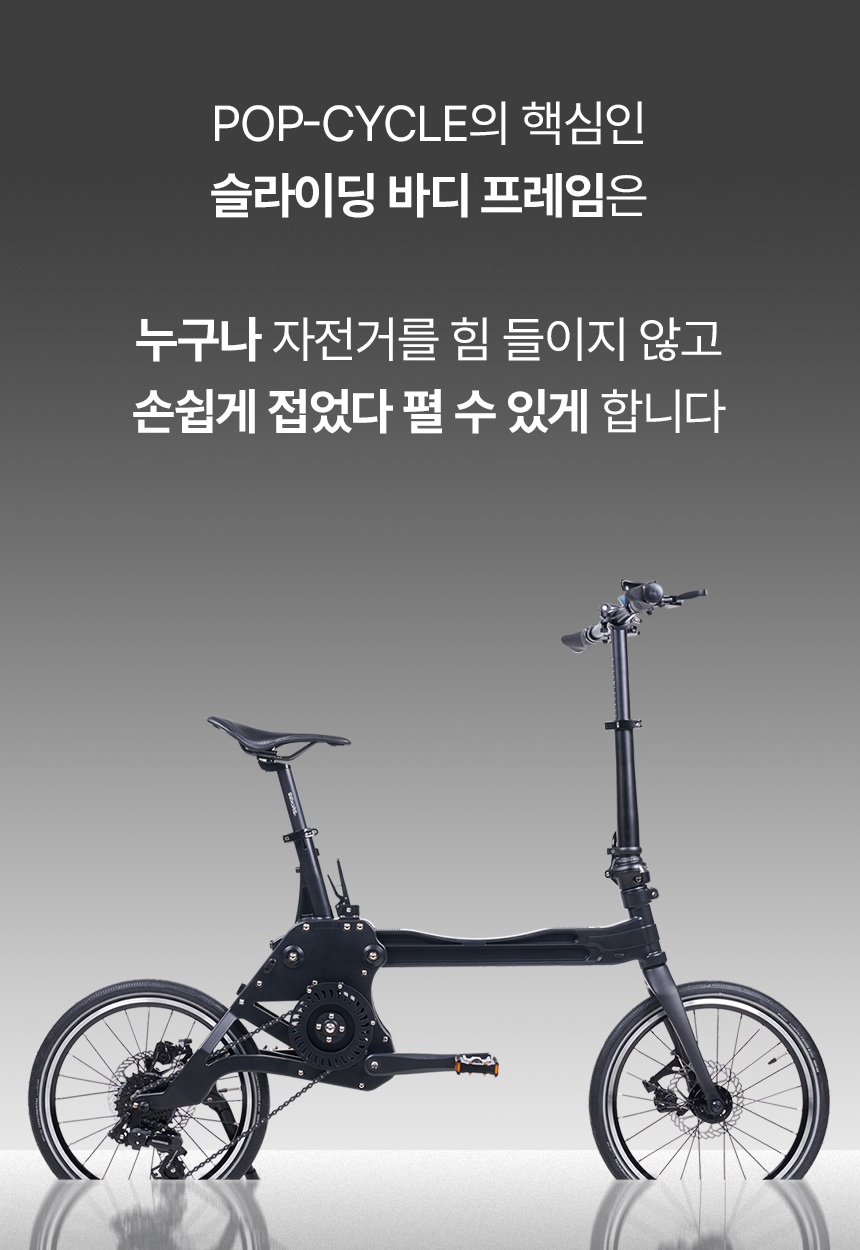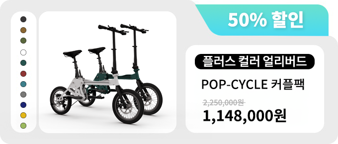 - 개발과정 중 "디자인적인 부분이나 기능적인 부분에서 어떻게하면 라이더분들이 좀더 편하고 만족스러운 라이딩을 할 수 있을까?"를 함께 고민을 하며 지금의 POP-CYCLE이 탄생하게 되었습니다. 기존의 불편하고 오래 걸리던 접이방식을 슬라이드 방식으로,칙칙한 색상과 디자인을 14가지 색상을 통한 세련된 프레임으로 제작하여 서포터분들의 만족도를 더욱 높혀 나갈 수 있도록 노력해 나아가고 있습니다.서포터분들이 후원해 주신 소중한 펀딩금은 보다 퀄리티 높은 모빌리티들을 개발하는데 사용할 계획입니다.