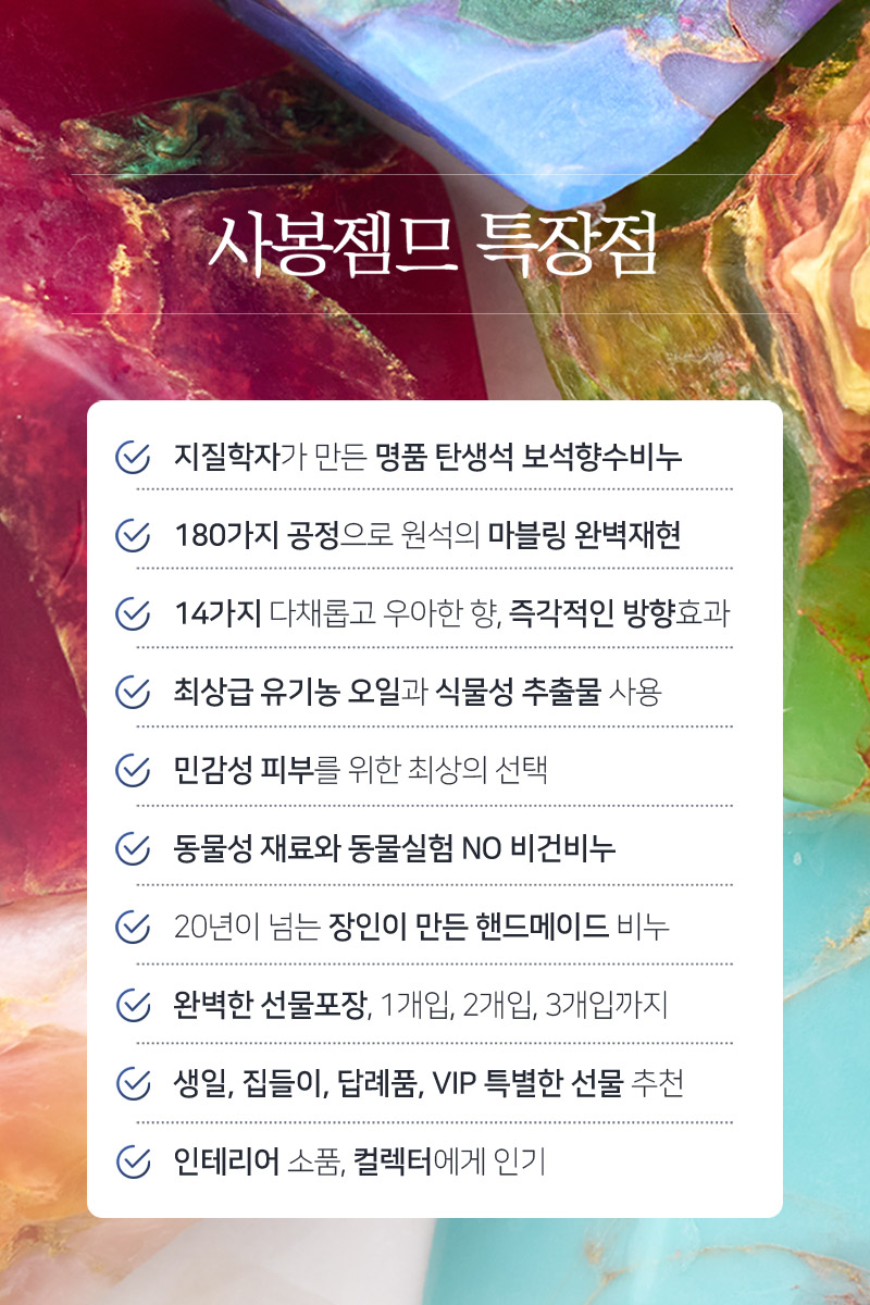 Experience daily luxury and unforgettable birthday gifts with 14 noble scents and lasting hydration in this handmade premium birthstone soap perfectly recreating the gem’s color and marbling through 180 processes over 20 years by a US geologist.