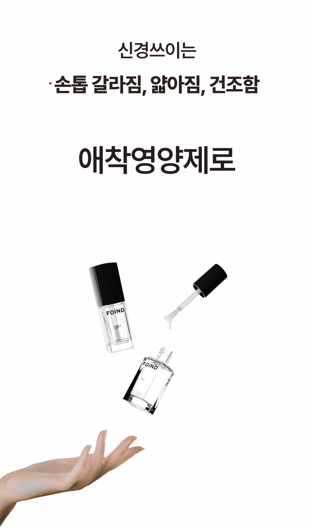 잦은 물 접촉과 건조가 반복되면, 손톱의 수분이 뺏기고 단백질 간의 결합력이 느슨해지며 손톱 강도가 약해져요. 애착영양제로 보호막을 만들어, 손톱의 수분을 지켜주세요.