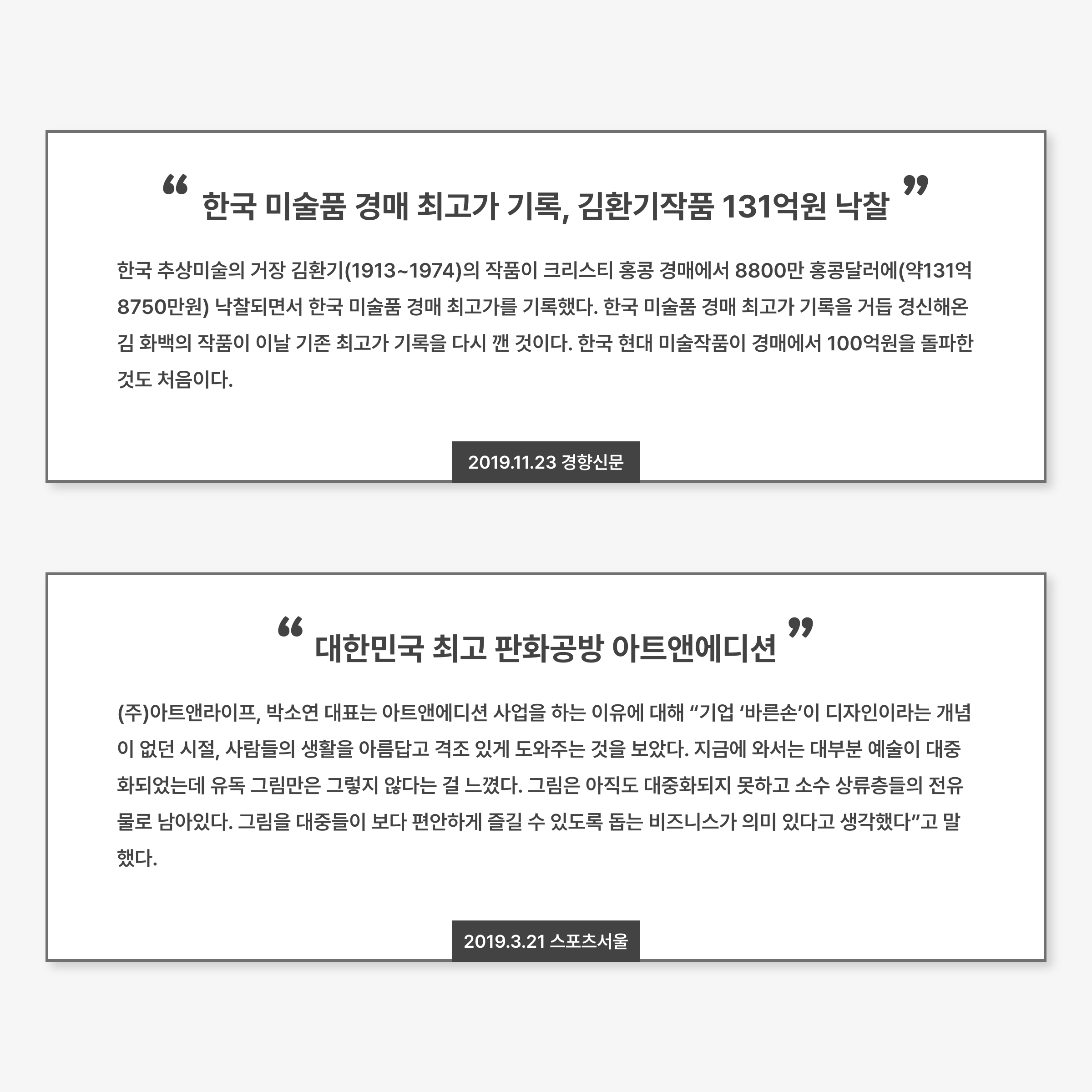 - 호텔, 기업, 병원, 관공서, 학교 등 1,500여곳이 넘는 업체의 아트컨설팅을 진행했습니다.