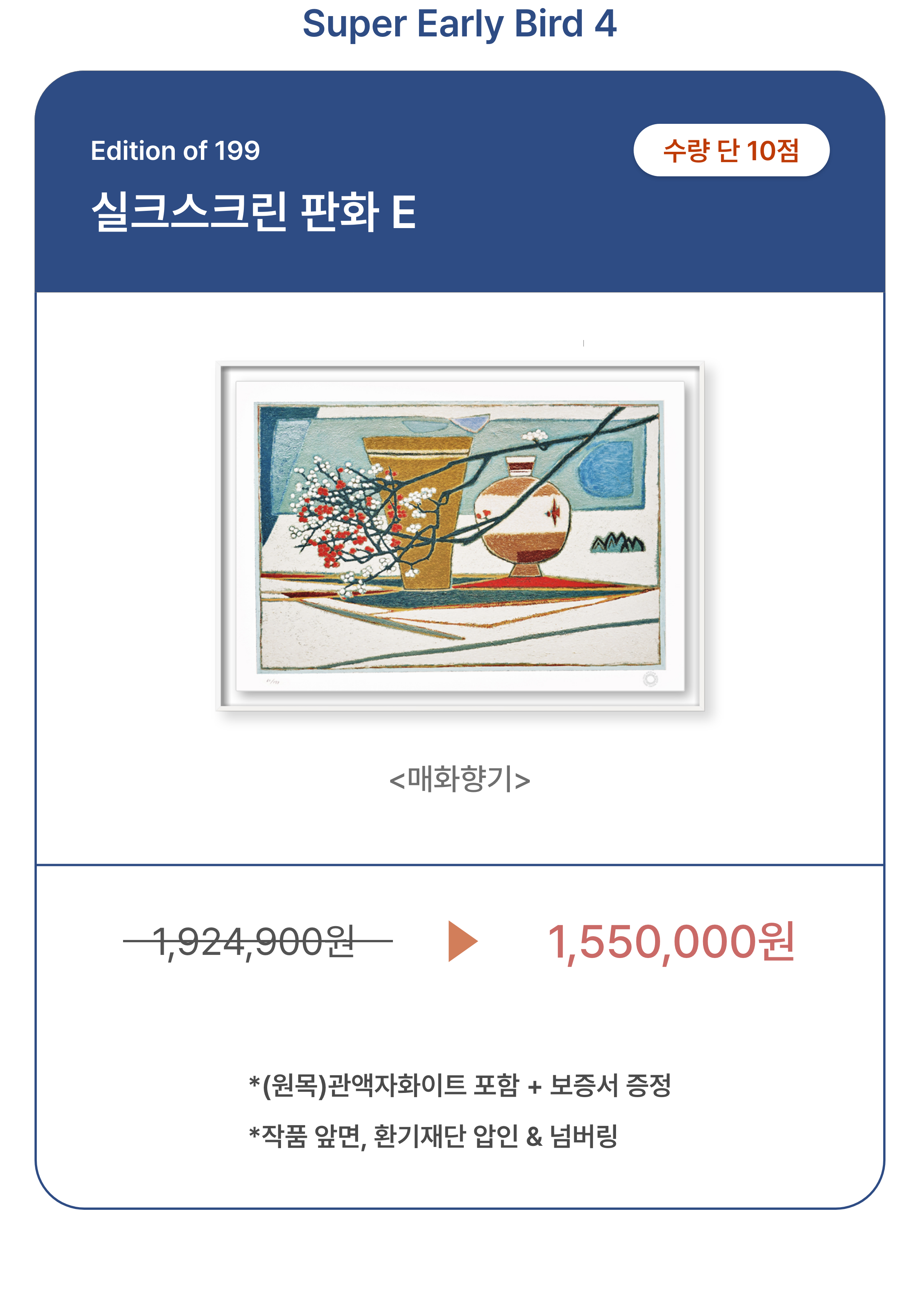 전문 컬렉터가 아니라면 그림을 처음 입문하는 입문자는 100-500만원대의 친숙한 국내 유명 작가의 작품구입이 안정적인 인사이트를 가져다주어 선호하는 편인데요 에디션 판화는 소장의 가치도 있고 집에 걸어두어도 미적 감수성이 뛰어난 요소가 있어 집에 걸어두기 위한 목적만으로도 작가님의 사인이 있는 에디션 판화를 구입하는 추세가 점차 늘고 있습니다.