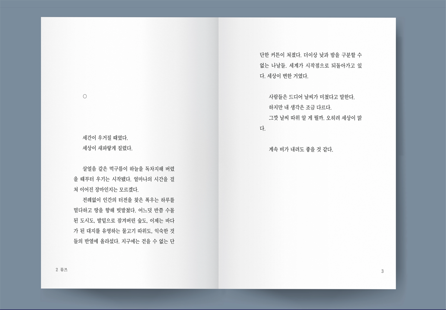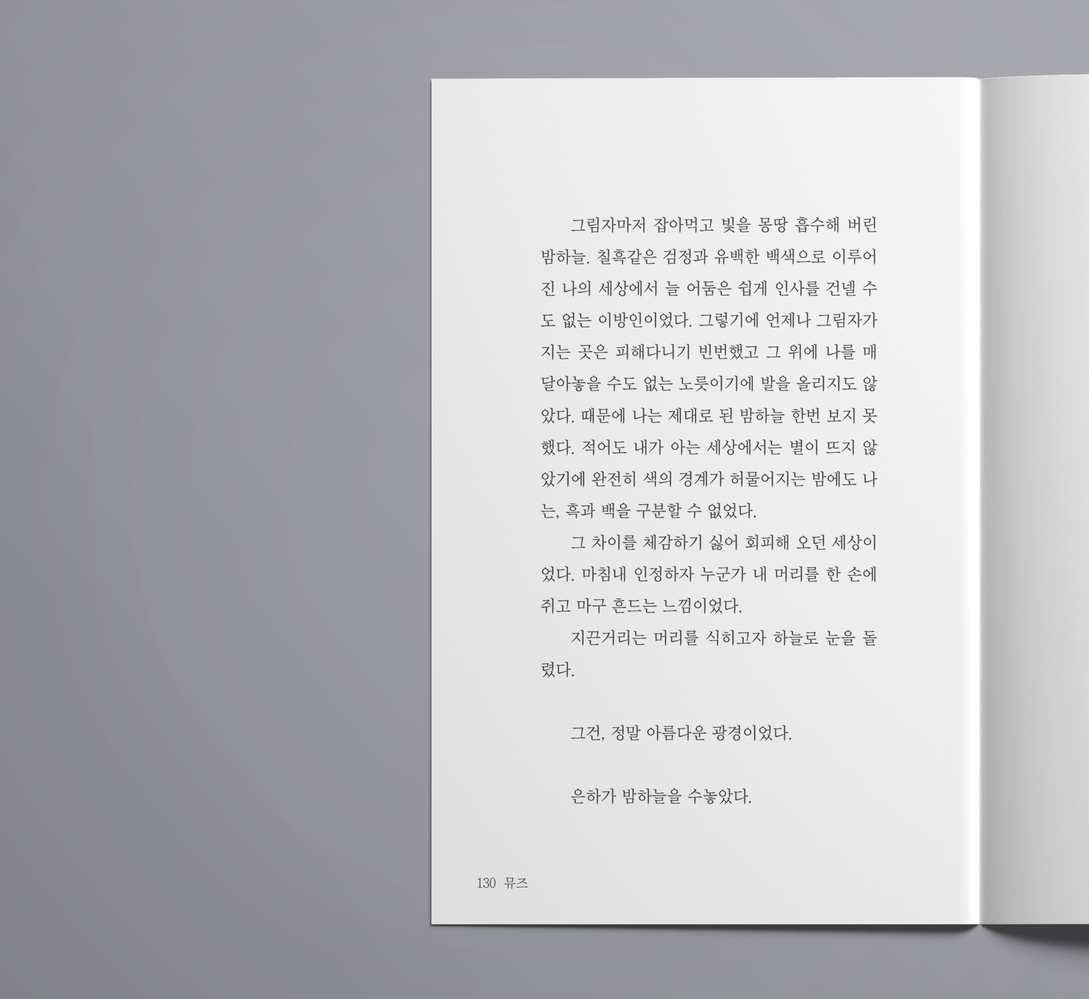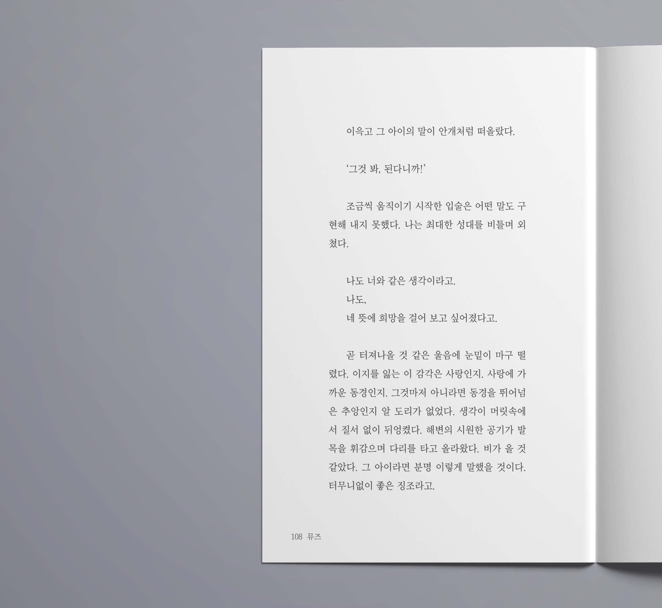 저의 첫 소설인 <뮤즈>를 통해 낙오된 이들의 이야기와 청년기를 겪는 사람들의 아픔을 위로하고, 자신은 볼 수 없던 세상에서 사는 타인을 통해 삶의 동기를 찾기 위해 고군분투하는 세상의 수많은 뮤즈들에게 저의 진심이 닿기를 바라며 출판 펀딩을 진행합니다.