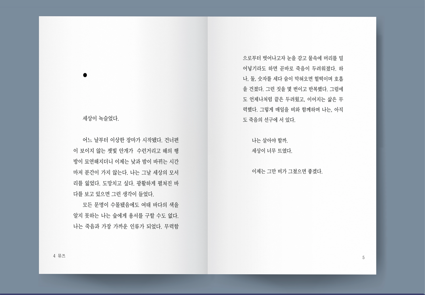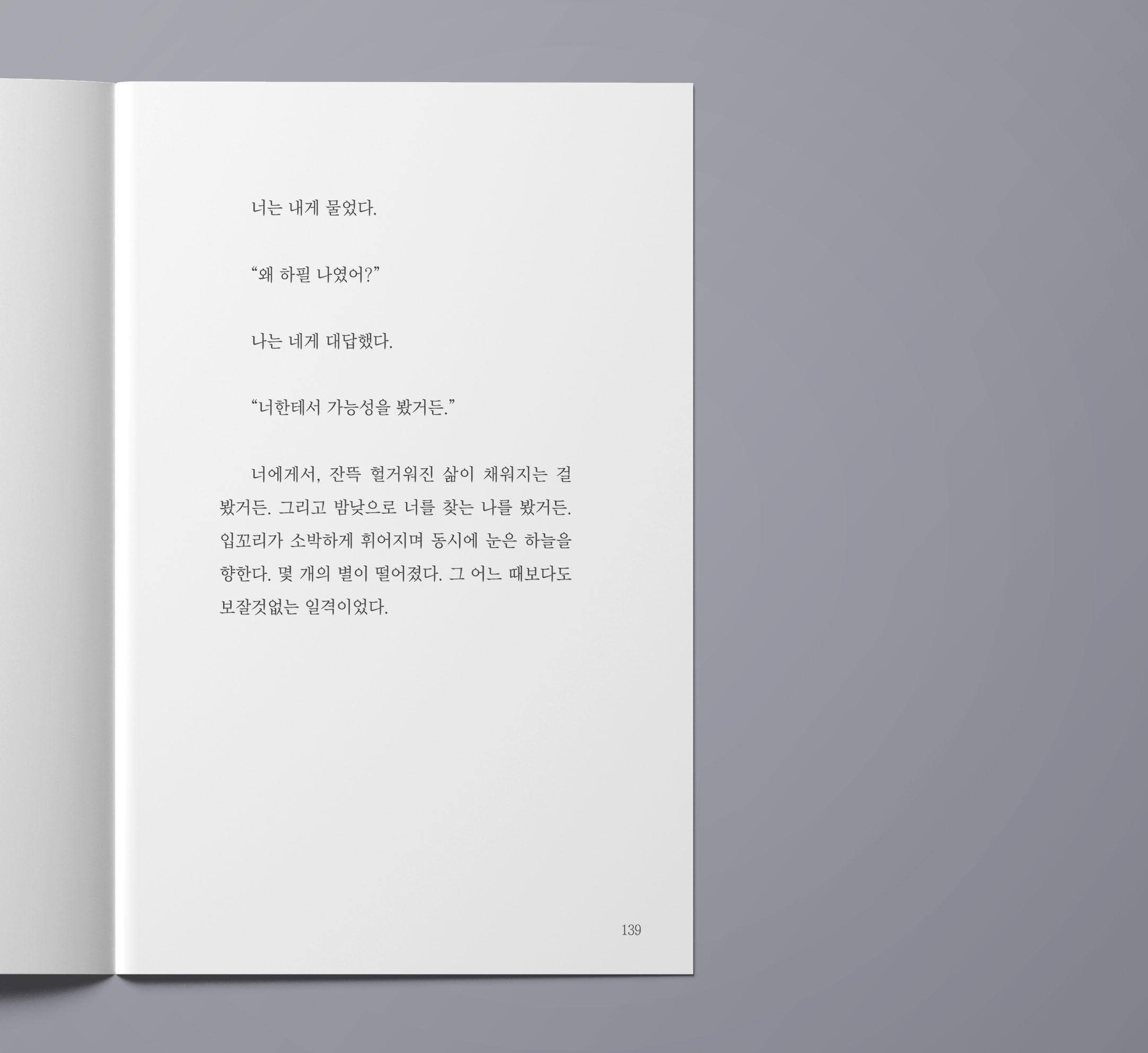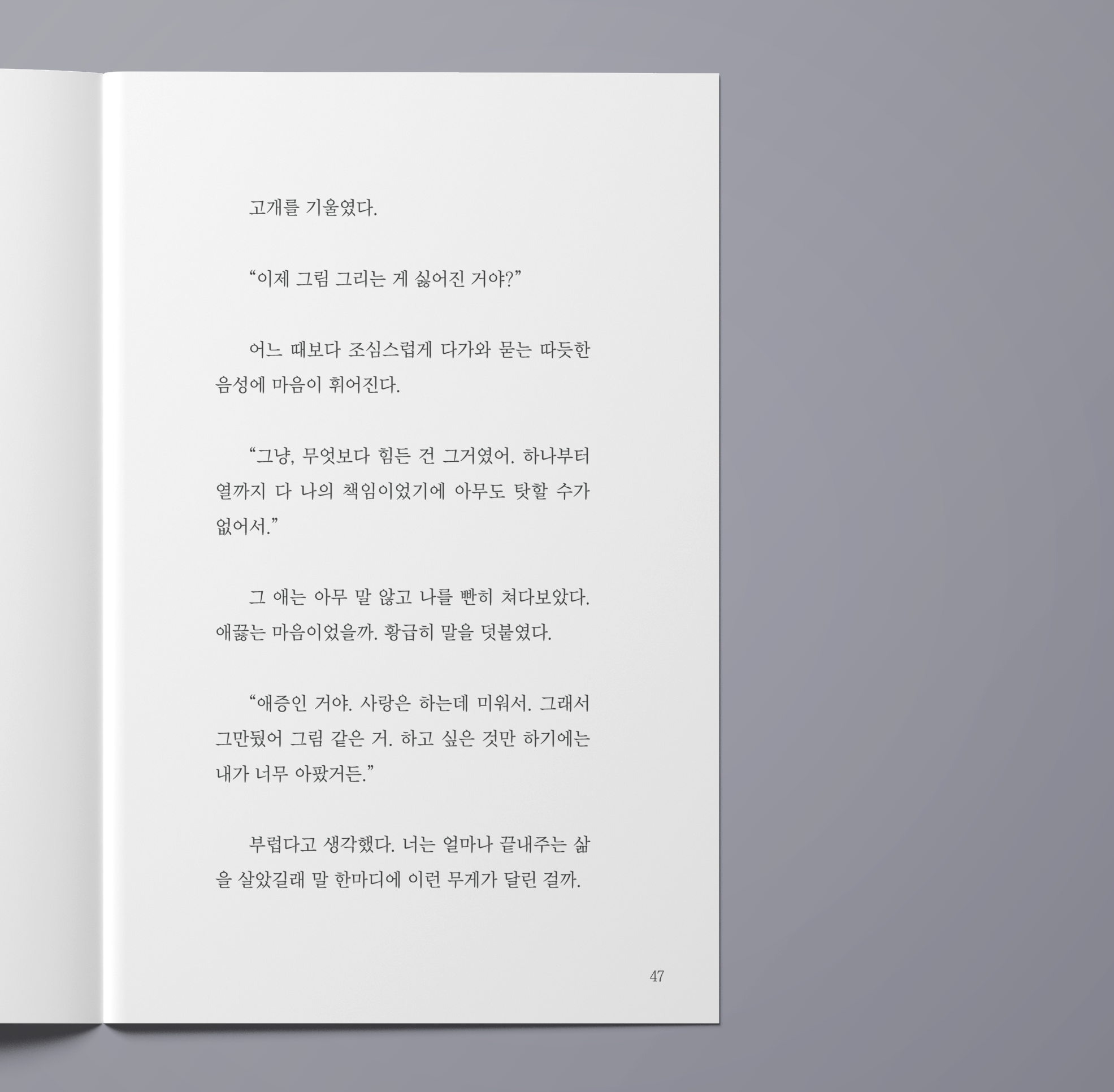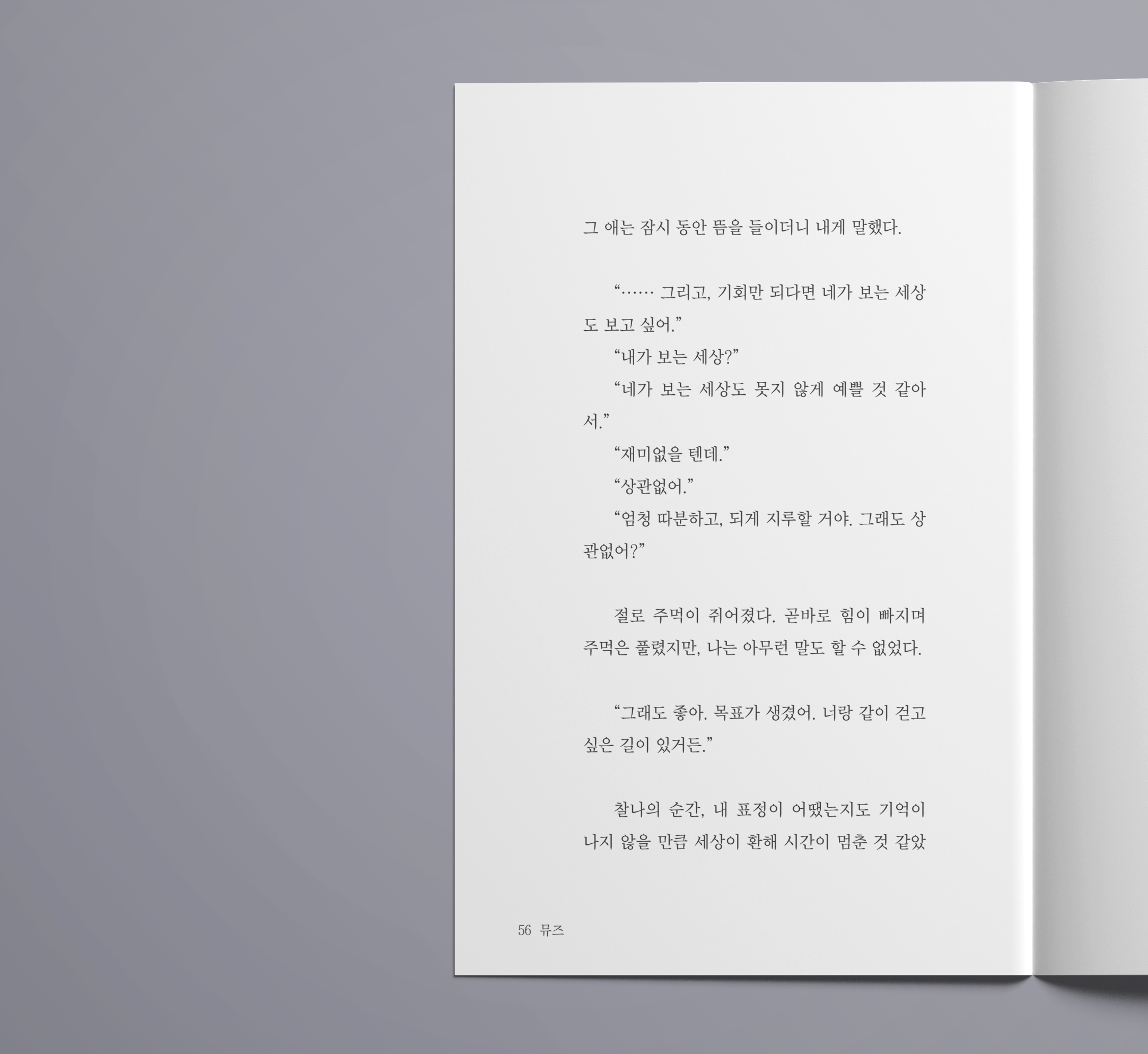 하지만 초고를 준비하는 과정에서 제가 한 가지 사실을 간과하고 있었다는 생각을 하게 됩니다. “나는 대체 누구에게, 혹은 어떤 것에 영감을 받아서 글을 쓰기 시작했을까?”하는 의문이요. 두드리던 자판을 내려놓고 가만 생각해 보니, 저에게도 뮤즈가 되어 주었던 한 친구가 있었습니다. 제가 좌절할 때면 늘 옆자리를 지켜 주고, 언제나 기꺼이 좋은 글감이 되어 준 친구요. 그 어렴풋한 곳에서부터 이미 이 이야기는 시작되고 있었던 게 아닐까? 하는 생각이 들었습니다.