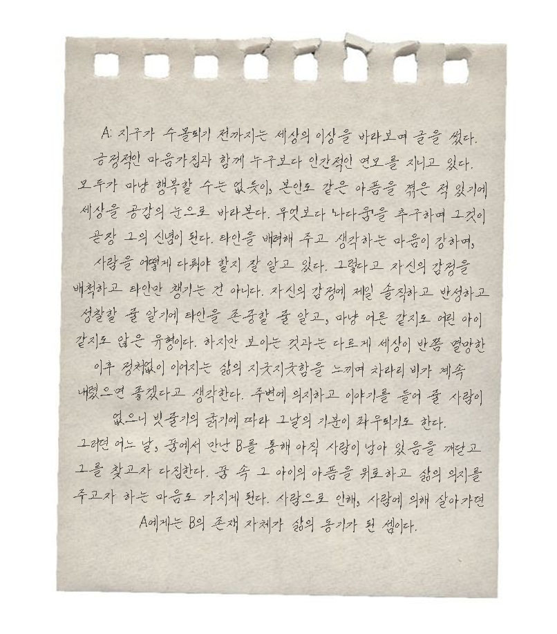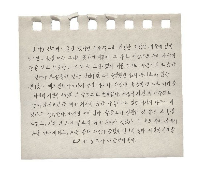 - 이후에도 둘은 종종 꿈에서 서로를 봤다. 둘의 삶에 대한 의지가 강해질수록 만나는 횟수도 늘어난다. 꿈속의 비도 점점 줄어들더니 어느 날 완전히 멎어버렸다. 그 아이를 보며 적어내렸던 세상, 그 아이를 보고 깨달은 세상의 온도. 서로를 보며 하나의 세상을 배웠고, 또한 서로에게 하나의 세상을 보여줬다.