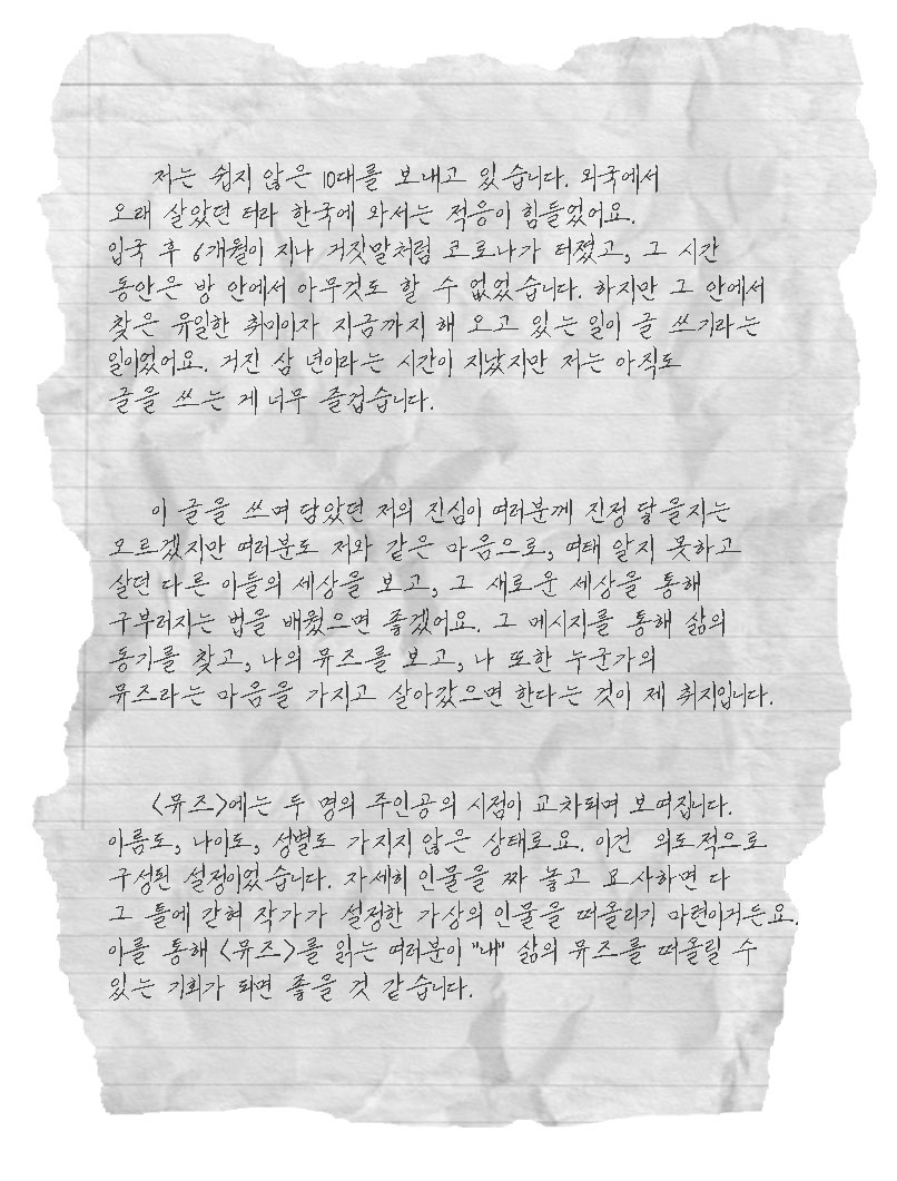 안녕하세요! 저는 현재 고등학교에 재학 중인 2학년 학생입니다. <뮤즈>의 모티프는, 원래 저를 주체로 작성되었던 소설입니다. 저도 내내 글을 쓰길 좋아하는 대한민국의 한 학생으로써 여러분께 저의 이야기를 해 드리고자 하는 마음에 펜을 잡고 쓰게 된 소설이에요. 앞서 말씀드렸듯, 원래의 <뮤즈>는 저와 같은 청소년을 대상으로 쓰여질 예정이었습니다.