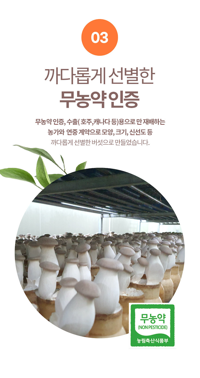 새송이의 모양과 크기는 새송이의 질감과 쫄깃한 식감에 많은 영향을 미칩니다. 그냥 구워먹어도 맛있는 최고 품질의 새송이 버섯만을 선별하였습니다!