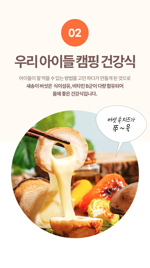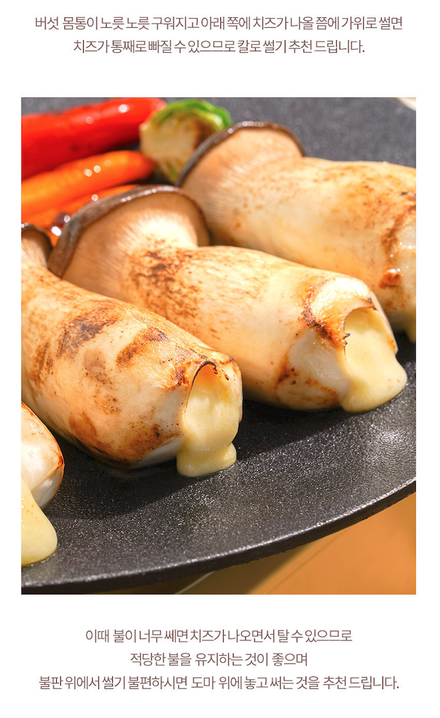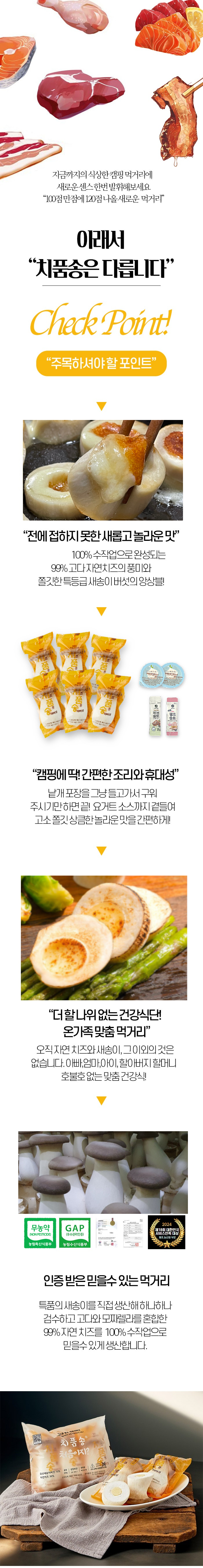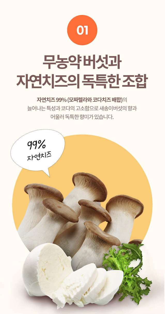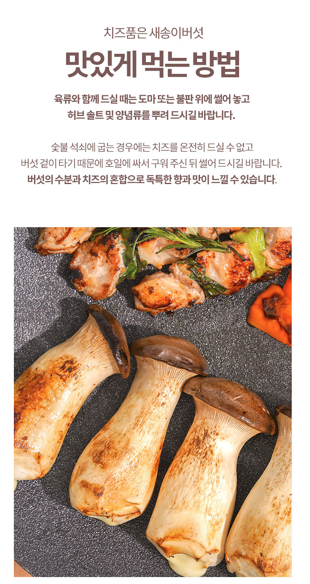 새송이의 기분 좋은 탄력 쫀득함을 지나 100% 자연치즈의 쫀득함,새송이의 부드러운 고소함을 지나 주는 고다 치즈의 강렬한 고소 감칠맛! 정말 안드셔 보시면 모릅니다. 신세계의 맛이예요! 사실 치품송의 출발은 야채를 골라내는 편식하는 아이에게 어떻게 하면 버섯이나 채소류을 잘 먹일수 있을까를 고민하다 만들어본 조합 입니다. 무엇보다도 편식 심한 아이들도 한번 먹고 계속 찾을 수 밖에 없는 놀라운 맛이 바로 치품송 입니다!