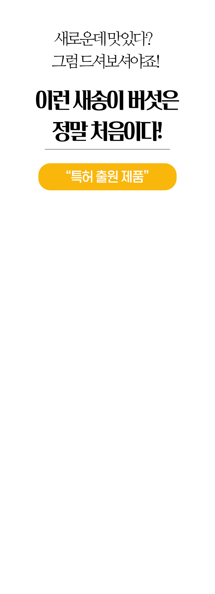 순수하게 새송이와 자연 치즈 입니다. 어떤 첨가물 없이 순수한 원물이기에 다어어트 하시는 엄마, 기름기를 피해야 하는 어르신들, 아동 등에게 부담을 줄일수 있는 건강 먹거리 입니다! 술 한잔 하시는 아빠에게도 너무 헤비하지 않으면서도 술안주로 적당한 포만감을 주는 기발한 아이템 입니다.