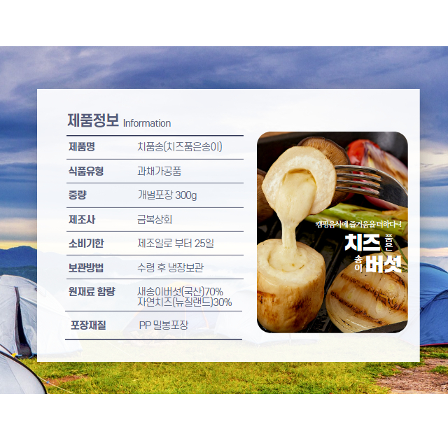 모양이 상하지 않고 큼직 번듯한 새송이를 선별해서 전부 먹기 좋게 커팅한 후 100% 수작업으로 치즈를 삽입해서 만들어지는 핸드메이드 제품으로 새송이의 생산, 선별, 치즈 배합 및 제품 완성까지 모두 저희가 직접 정성스럽게 만들고 있습니다.