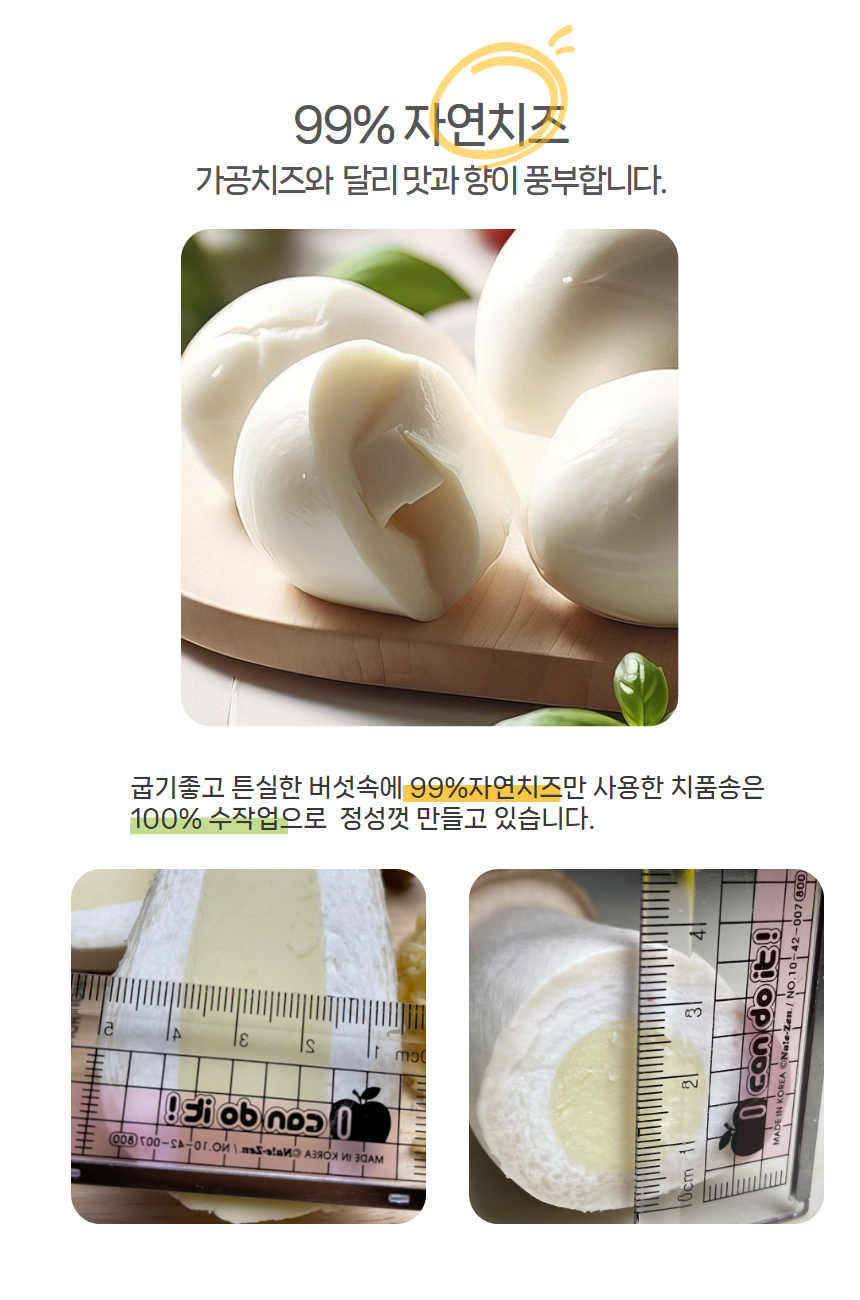 쫄깃한 식감을 낼수 있는 99% 자연 모짜렐라 치즈와 풍미를 더해줄 고소함을 더해줄 자연 고다 치즈의 배합으로 치즈의 쭈~욱 폭신폭신 쭈욱 늘어지는 식감과 함께 입안 가득 퍼지는 고소한 고다 치즈 특유의 맛을 살렸습니다. 100%라고 이야기하지 않는 것은 이세상에 100%는 존재하지 않는다고 생각하기에 99%로 적은 것이며 프리미엄 자연치즈를 배합한 치즈의 풍미가 인공치즈와는 결이 다릅니다.