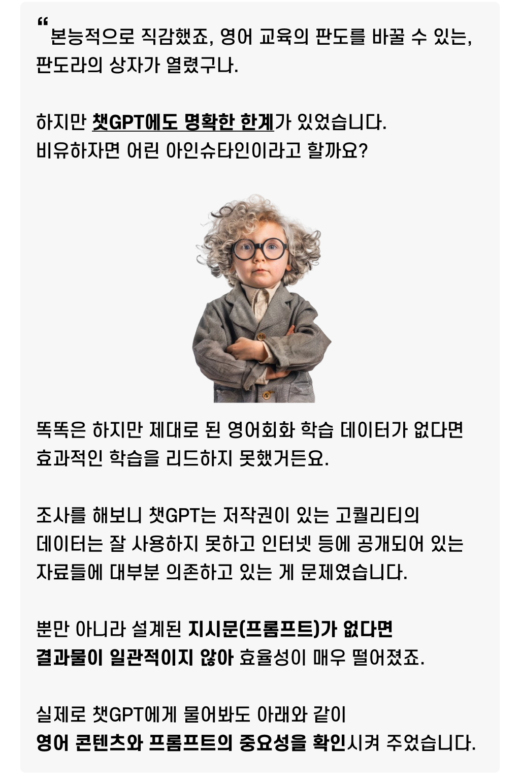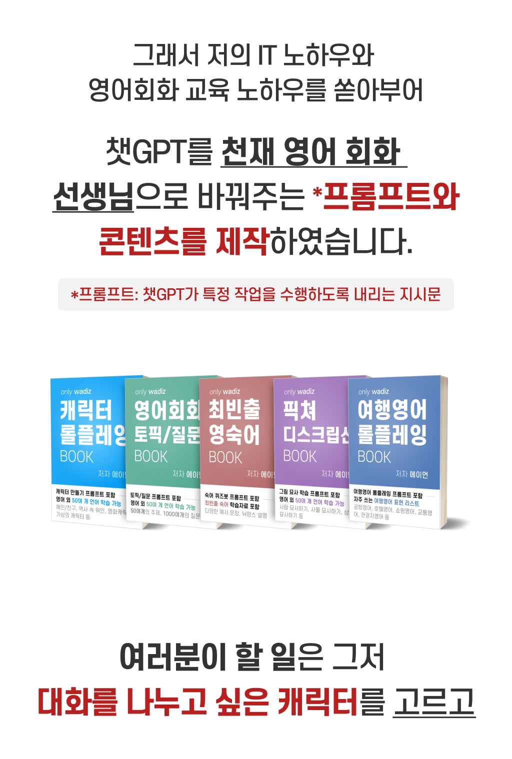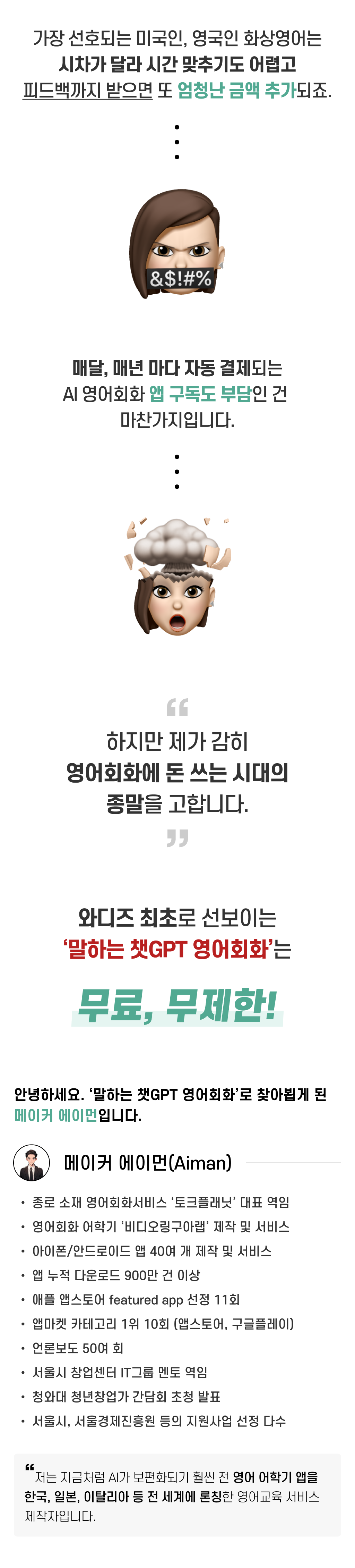 저는 IT업계에서 오래 사업을 했었고 영어회화스터디를 운영하던 시절 제작했던 콘텐츠도 풍부했기에 재빠르게 챗GPT 와 하는 영어회화라는 장르를 개척하여 다양한 테스트를 진행하였고 마침내 ‘말하는 챗GPT 영어회화’를 제작하게 되었습니다. 그리고 아직은 생소하고 아직은 많이 시도되지 않은 이런 프로젝트를 세상에 공개하는데 가장 적합한 곳은 단연 국내 1위 펀딩 플랫폼 와디즈였습니다. 본 와디즈 프로젝트를 통해 최대한 많은 분들이 무료로, 무제한으로 무엇보다 재미있게 어학연수 이상의 영어회화 학습효과를 누리시기를 바랍니다.