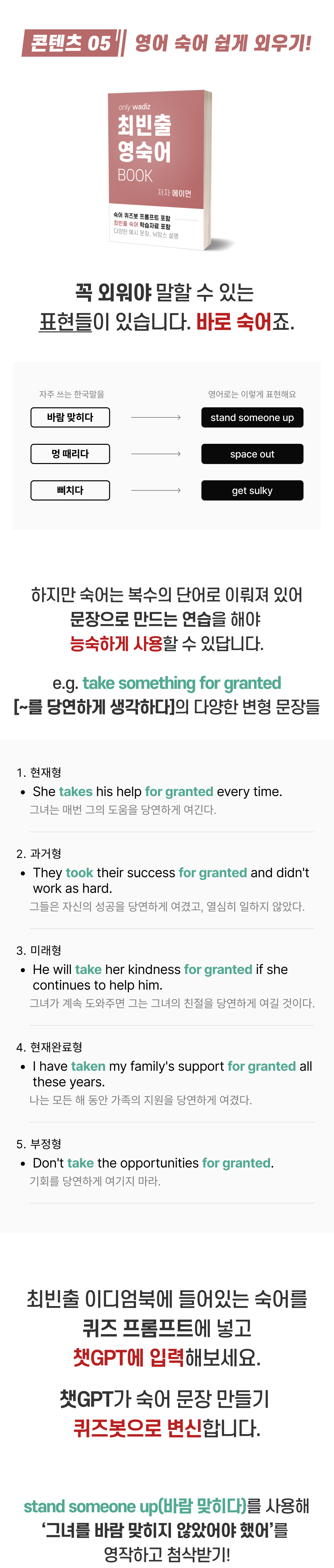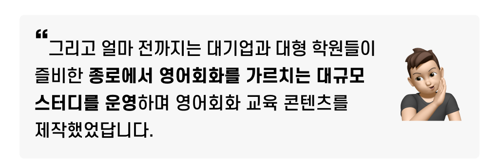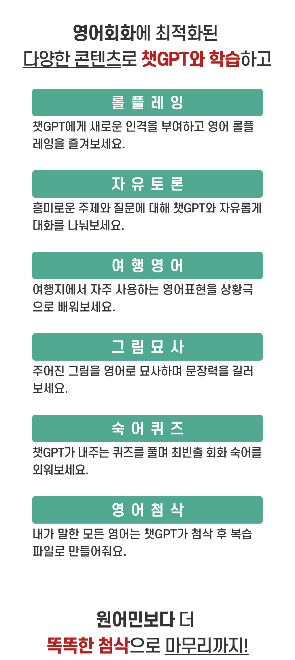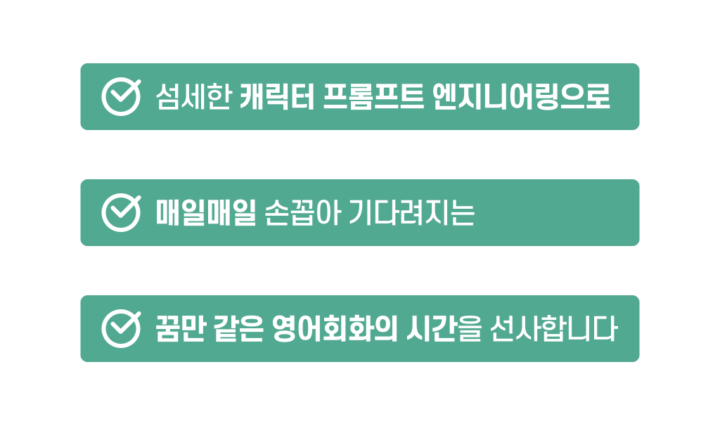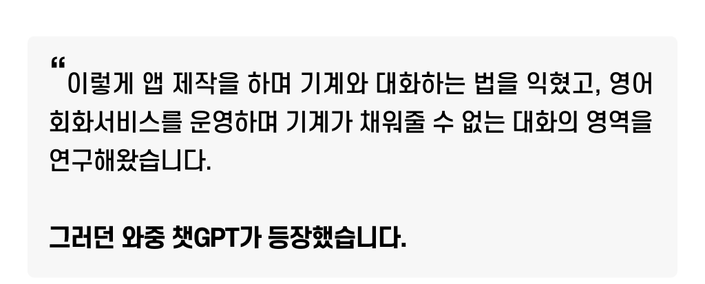 저는 IT업계에서 오래 사업을 했었고 영어회화스터디를 운영하던 시절 제작했던 콘텐츠도 풍부했기에 재빠르게 챗GPT 와 하는 영어회화라는 장르를 개척하여 다양한 테스트를 진행하였고 마침내 ‘말하는 챗GPT 영어회화’를 제작하게 되었습니다. 그리고 아직은 생소하고 아직은 많이 시도되지 않은 이런 프로젝트를 세상에 공개하는데 가장 적합한 곳은 단연 국내 1위 펀딩 플랫폼 와디즈였습니다. 본 와디즈 프로젝트를 통해 최대한 많은 분들이 무료로, 무제한으로 무엇보다 재미있게 어학연수 이상의 영어회화 학습효과를 누리시기를 바랍니다.