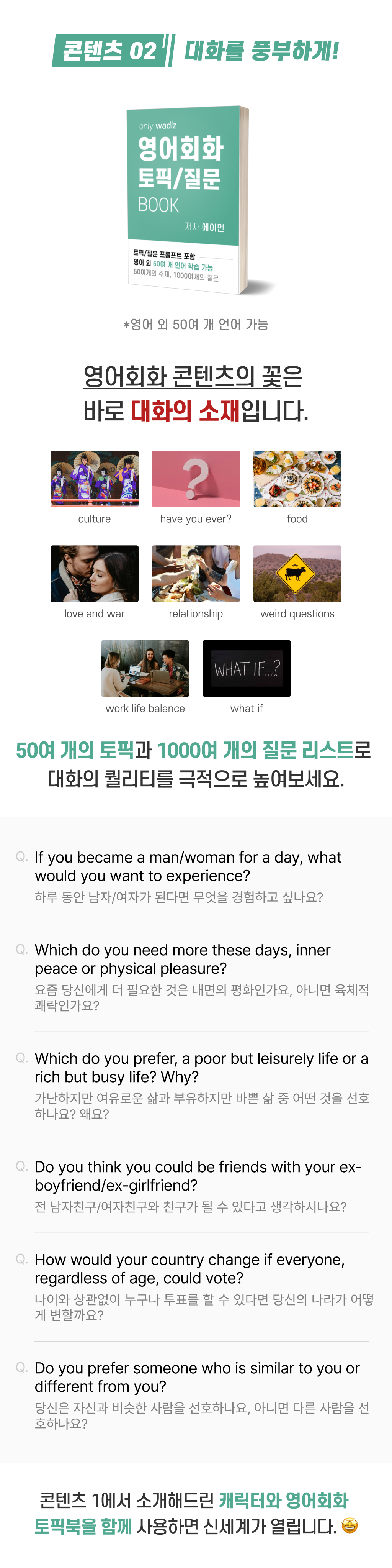 네 가능합니다. 스토리의 각 콘텐츠 설명 상단에 표기해 놓은 것처럼 영어에만 국한 된 영숙어와 여행영어 롤플레잉을 제외한 캐릭터 롤플레잉, 토픽/질문, 그림묘사 등은 모두 프랑스어, 중국어, 스페인어, 일본어 등등 타 외국어로도 학습이 가능합니다.