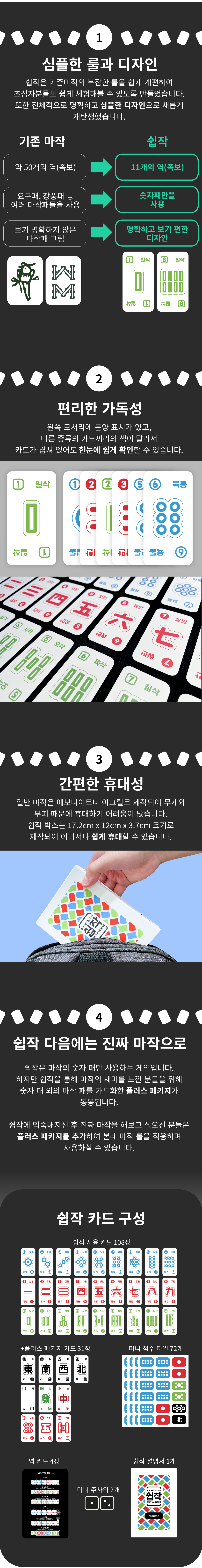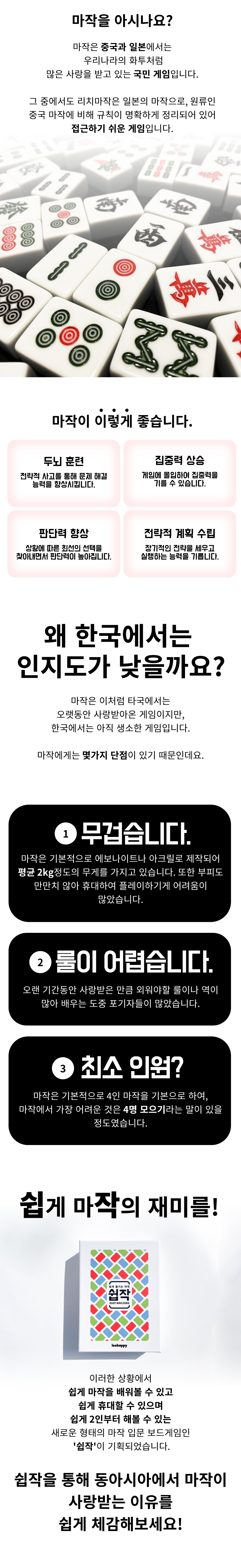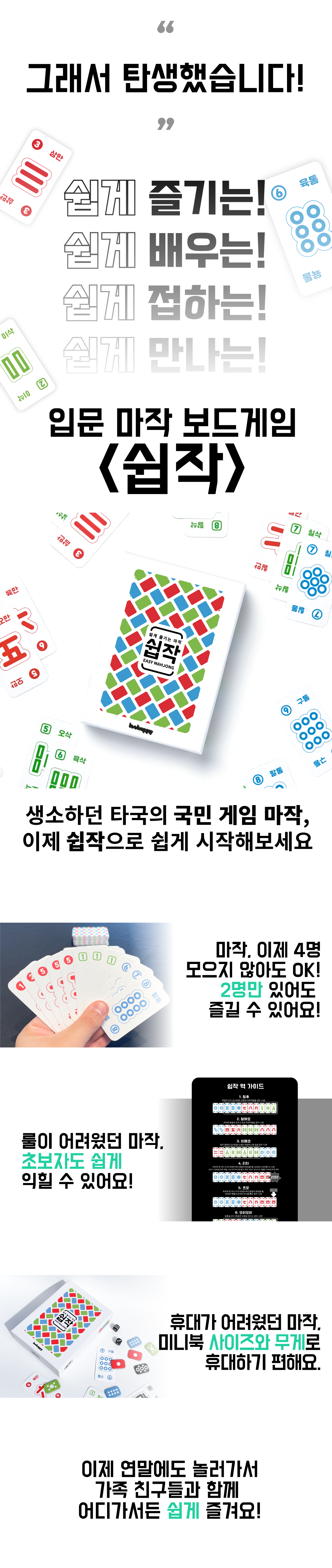 다양한 전략과 즐거움, 그리고 지인들과의 소통의 장이 되는 마작의 매력을 많은 분들께 알리고 싶었습니다. 이를 위해 기존의 마작을 보다 쉽고 간편하게 즐길 수 있는 ‘쉽작’을 개발하게 되었습니다.