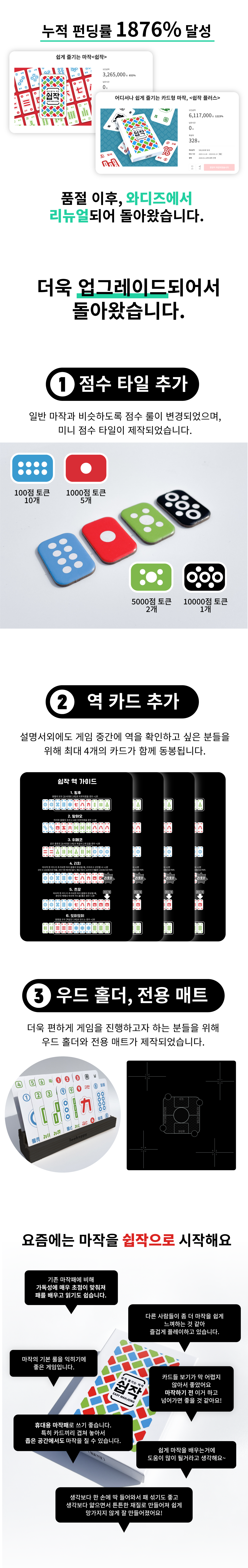 와디즈는 새롭고 창의적인 아이디어를 중시하는 분들이 모인 플랫폼으로, 저의 프로젝트를 소개하기에 매우 적합한 곳이라고 생각했습니다. 이곳을 통해 ‘쉽작’이 더 많은 사람들에게 알려지고, 마작의 즐거움이 널리 퍼지기를 기대합니다.