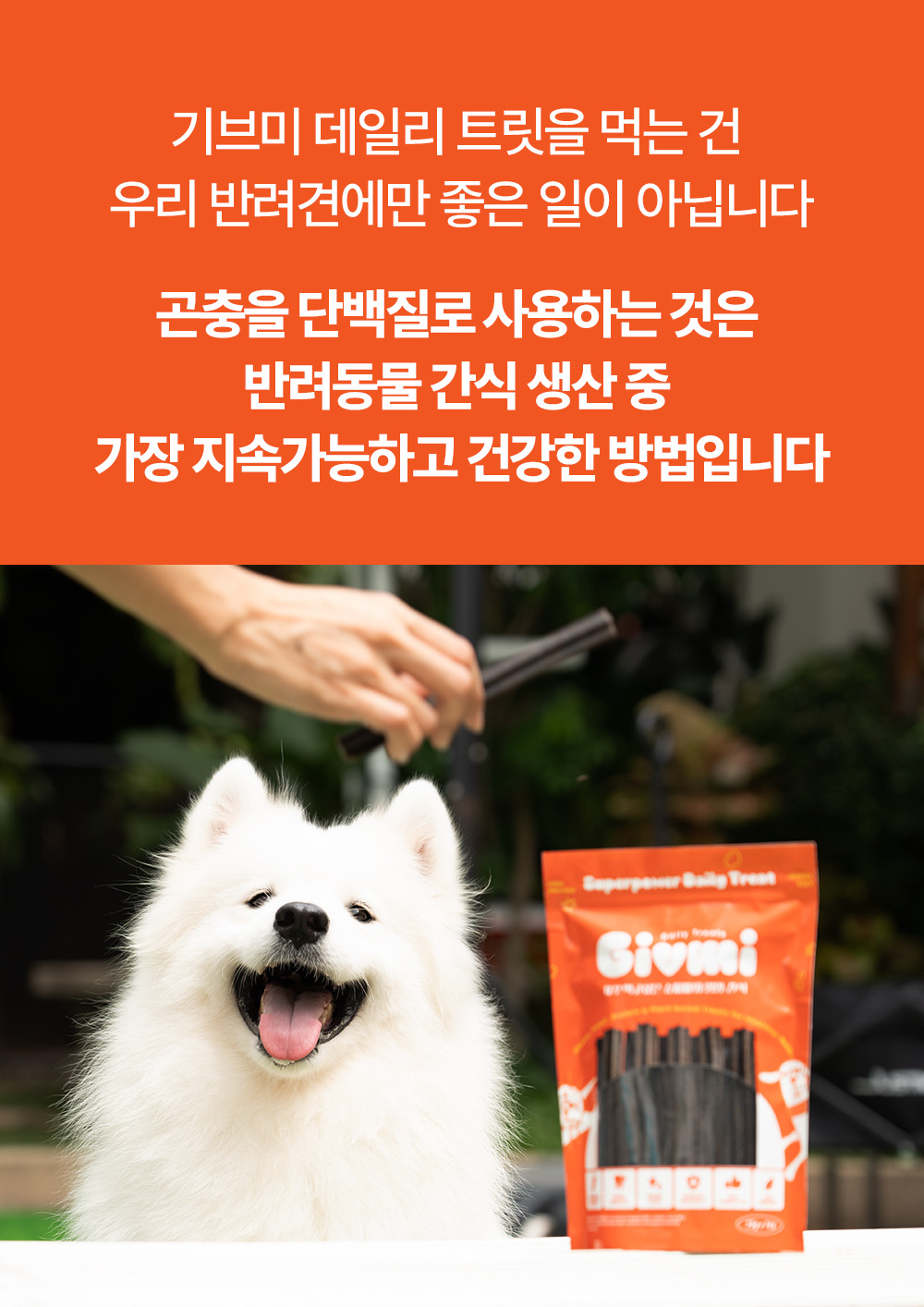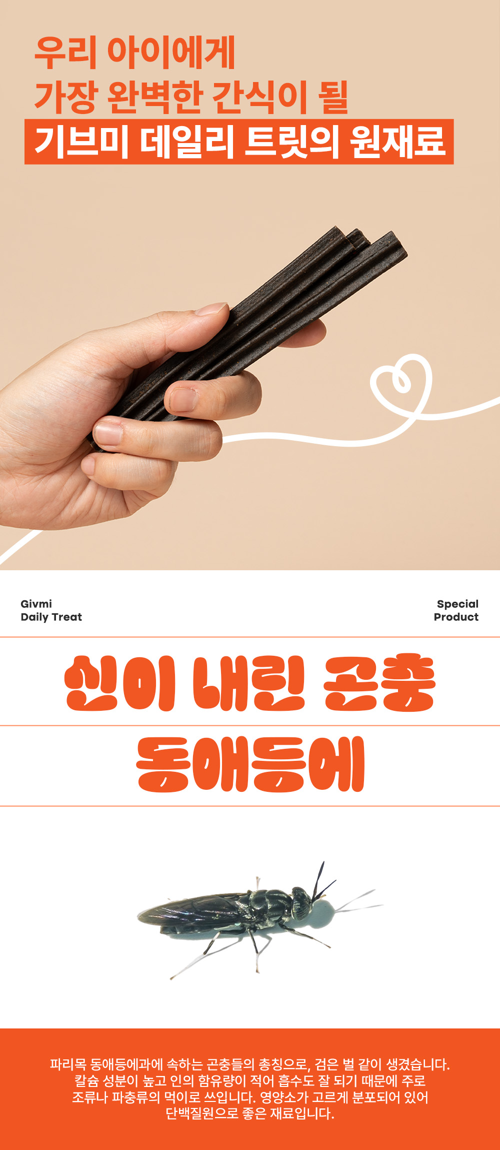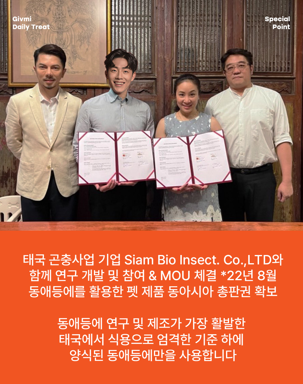 동애등에 관련 사업이 활성화 되어있는 태국을 거점으로 반려동물 먹거리를 생산하고자 마음먹게 된 것이 기브미 데일리 트릿의 시작이었습니다. 직접 공장을 찾고 제품 개발을 하며 지금의 기브미 데일리 트릿을 만들었고요!