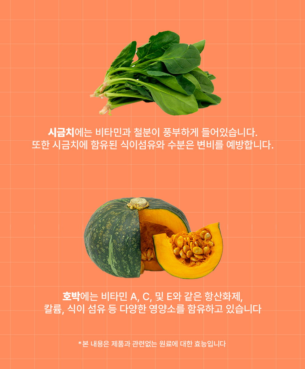 호박과 시금치는 비타민과 미네랄, 식이섬유를 함유하고 있으며 우리 아이들이 좋아하는 맛을 제공합니다. 특히 호박은 개의 장 건강을 향상하는 데 도움이 되며, 시금치는 주요 비타민, 베타카로틴 및 철(Fe)을 제공합니다.