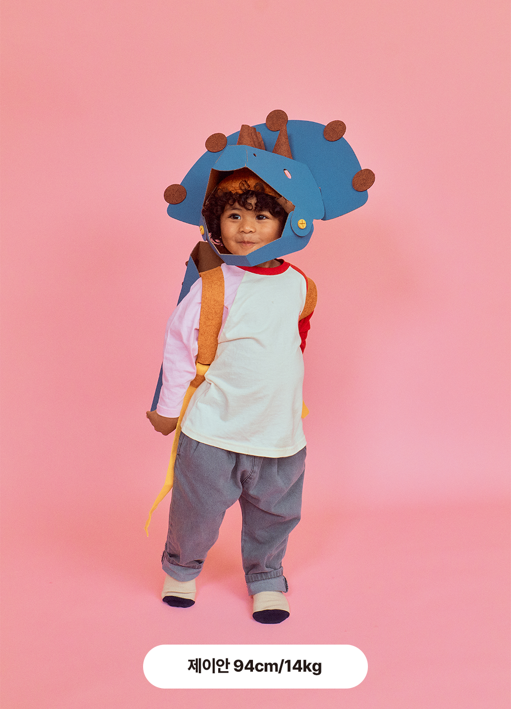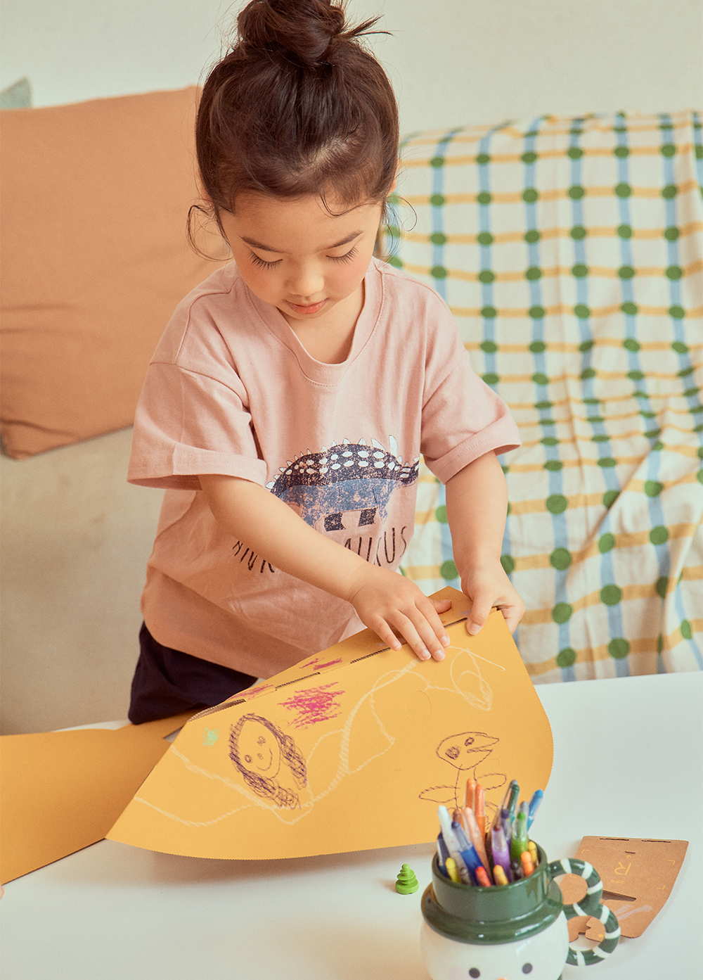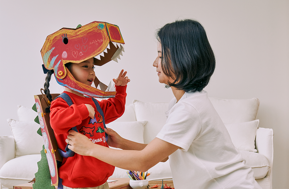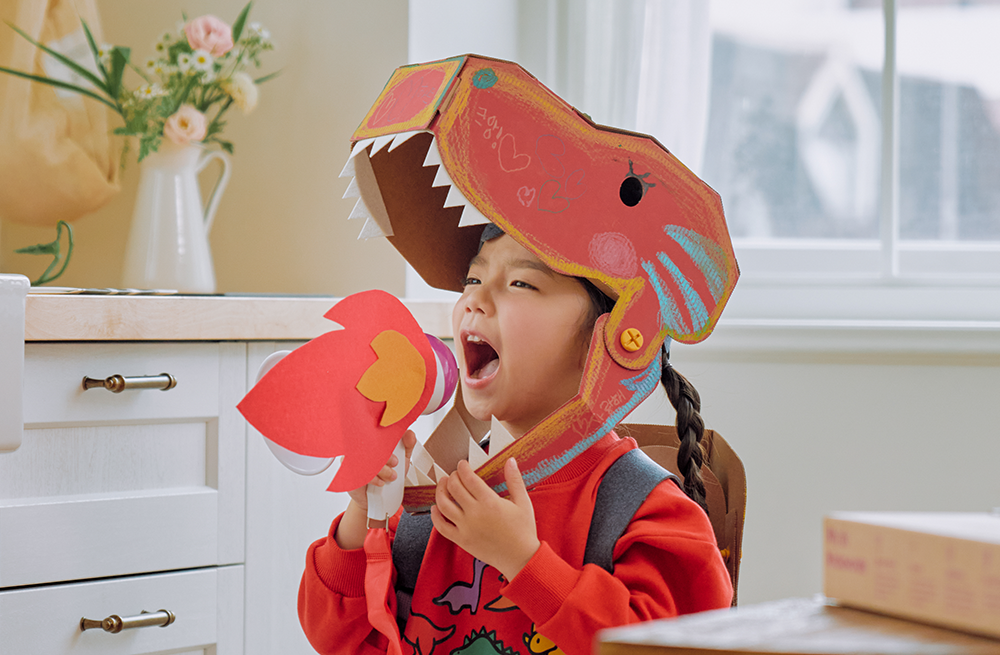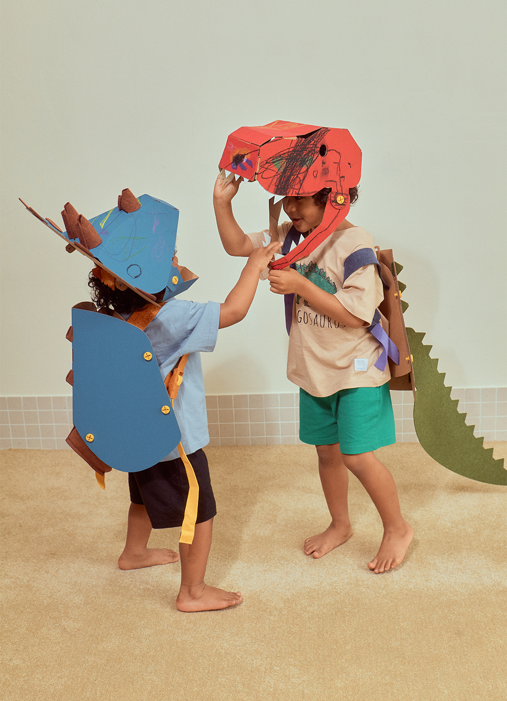 아이들이 충분히 놀고 나면, 헤드밴드와 몸통 부분의 행거 구멍을 이용해 벽 또는 행거 걸이에 걸어 보관해 주세요. 아이들이 공룡이 되고 싶을 때 언제든 찾아와서 입을 수 있게요! 혹은, 거실 한 곳에 근사한 작품처럼 전시해주셔도 좋아요. 훗날 진짜 갤러리에 우리 아이의 그림이 걸릴 지도 모르니까요!