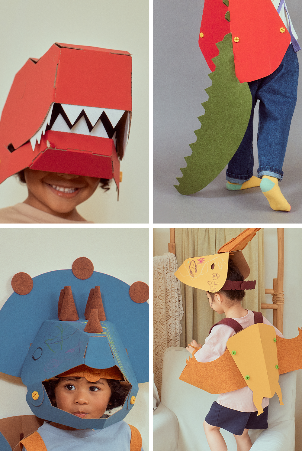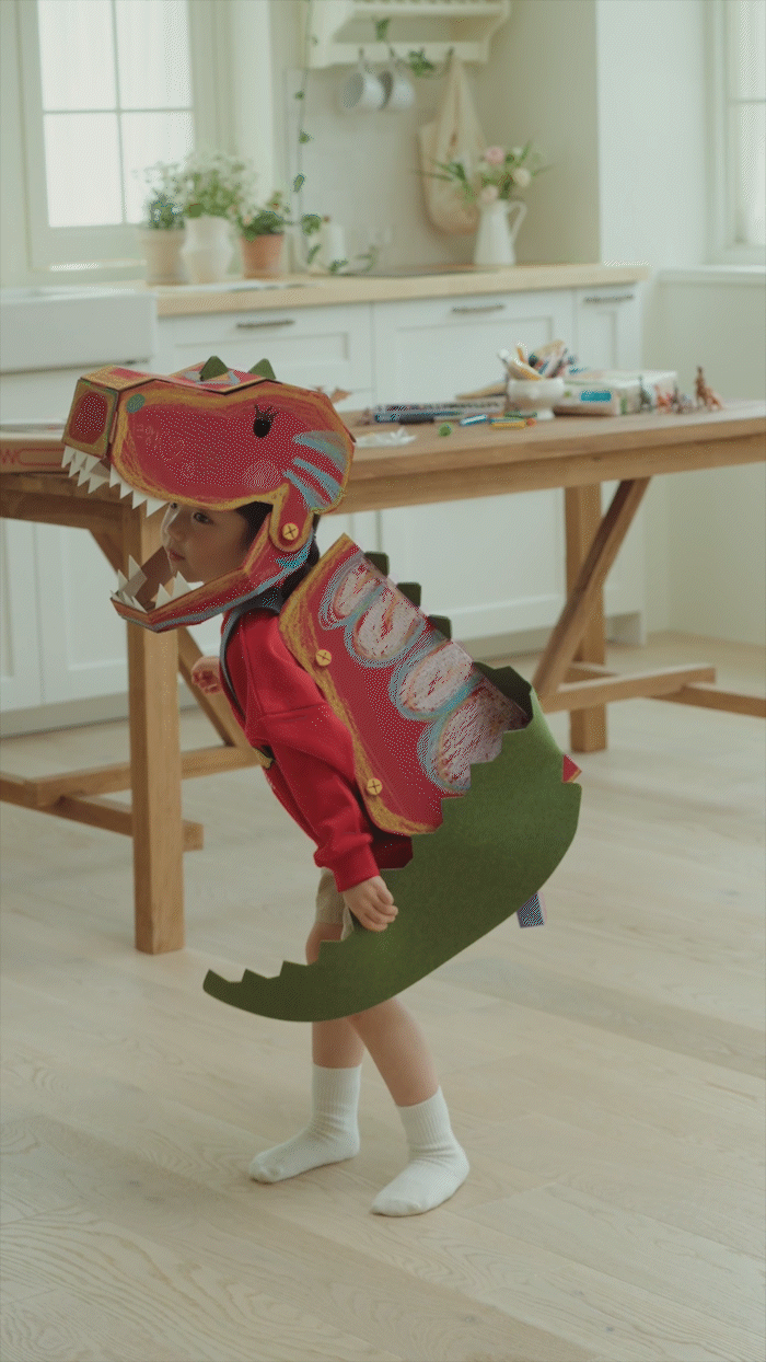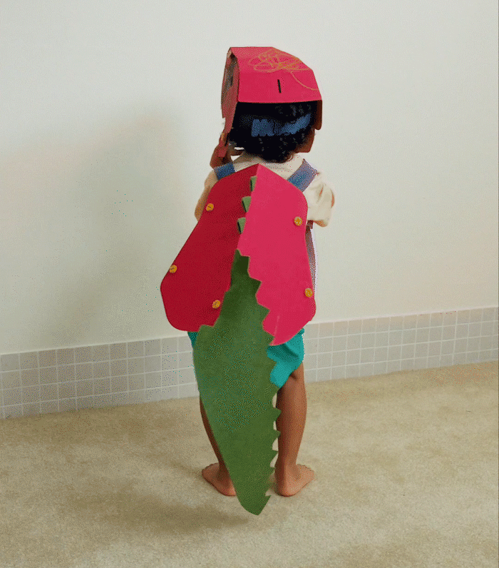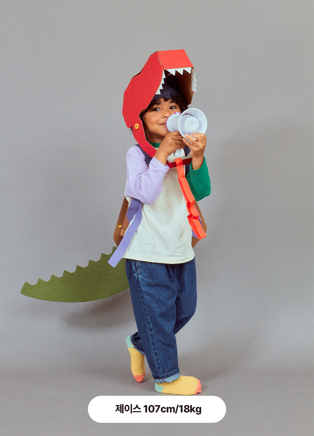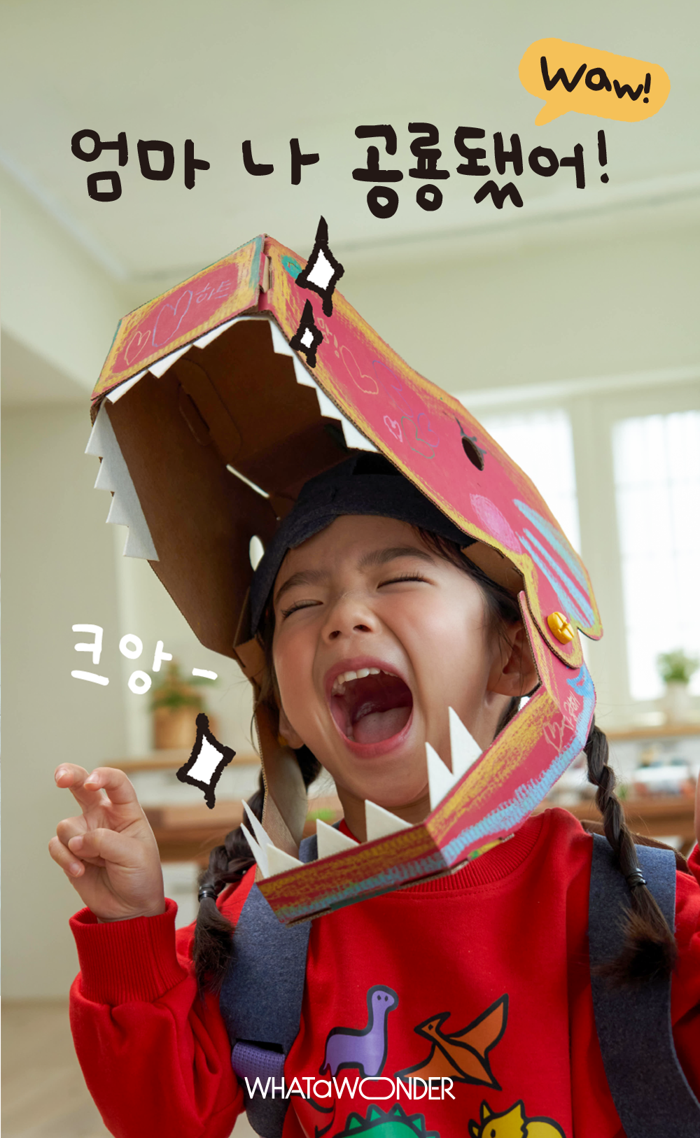 아이들이 충분히 놀고 나면, 헤드밴드와 몸통 부분의 행거 구멍을 이용해 벽 또는 행거 걸이에 걸어 보관해 주세요. 아이들이 공룡이 되고 싶을 때 언제든 찾아와서 입을 수 있게요! 혹은, 거실 한 곳에 근사한 작품처럼 전시해주셔도 좋아요. 훗날 진짜 갤러리에 우리 아이의 그림이 걸릴 지도 모르니까요!