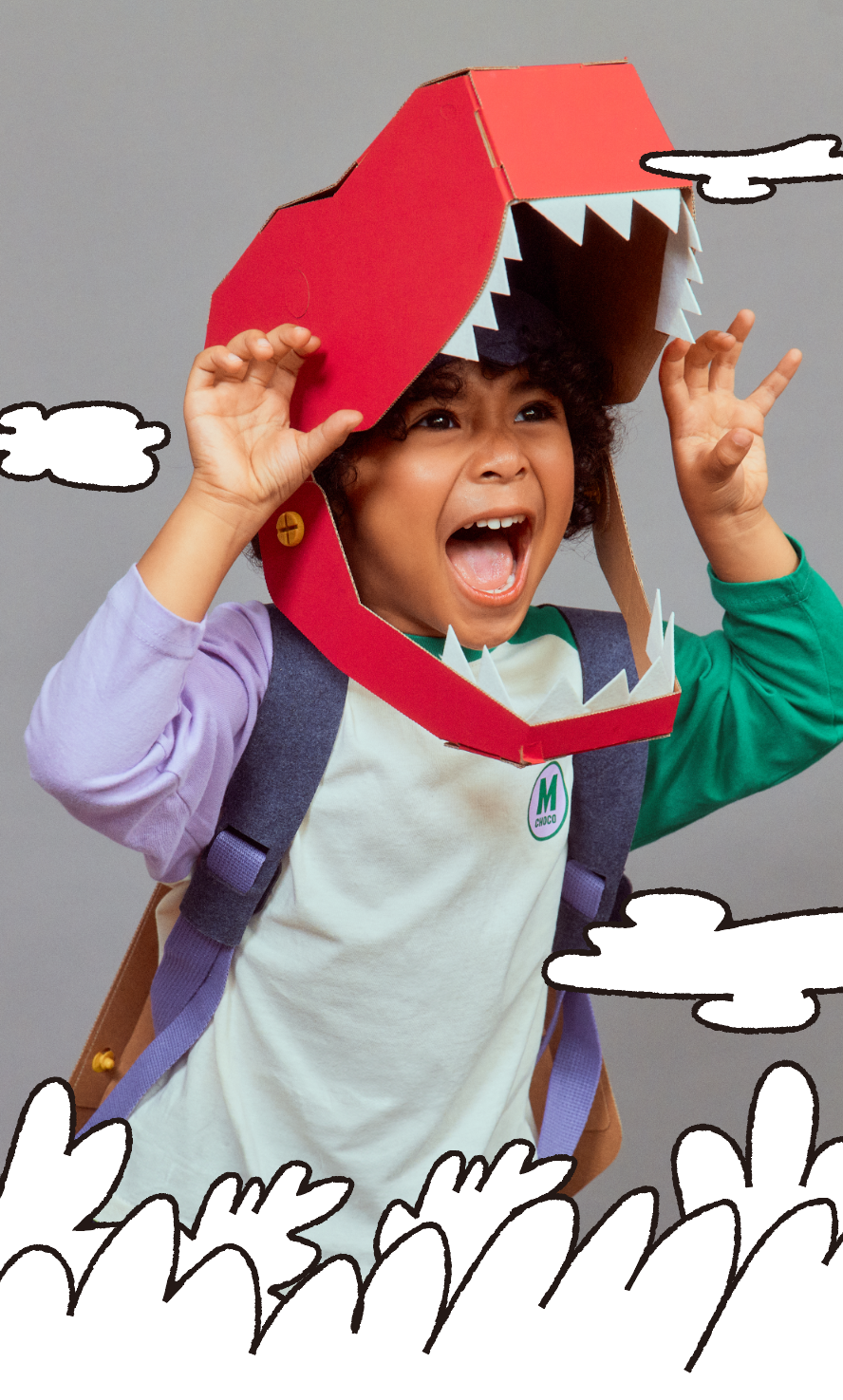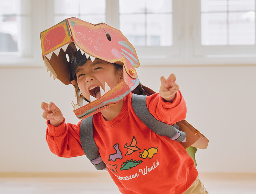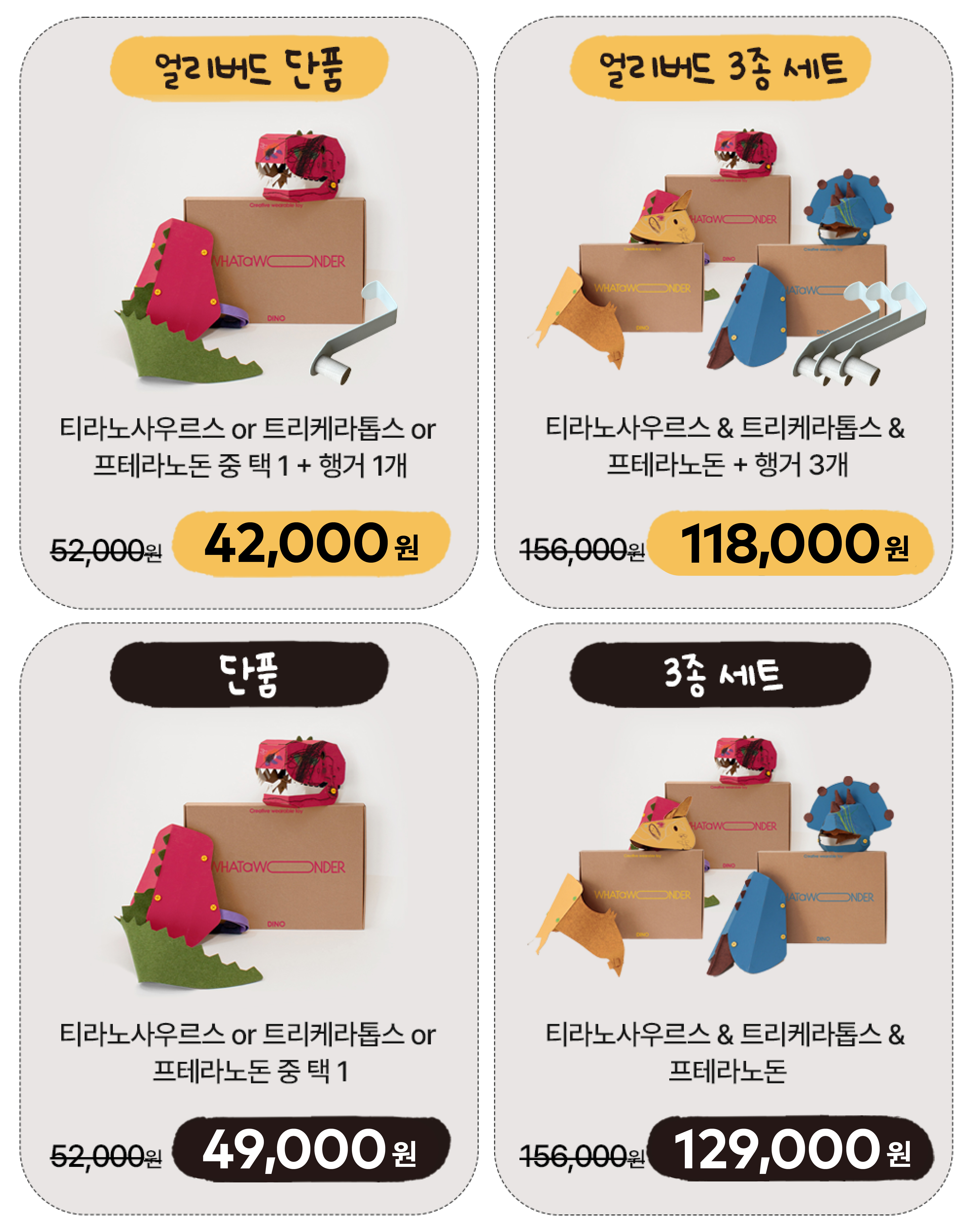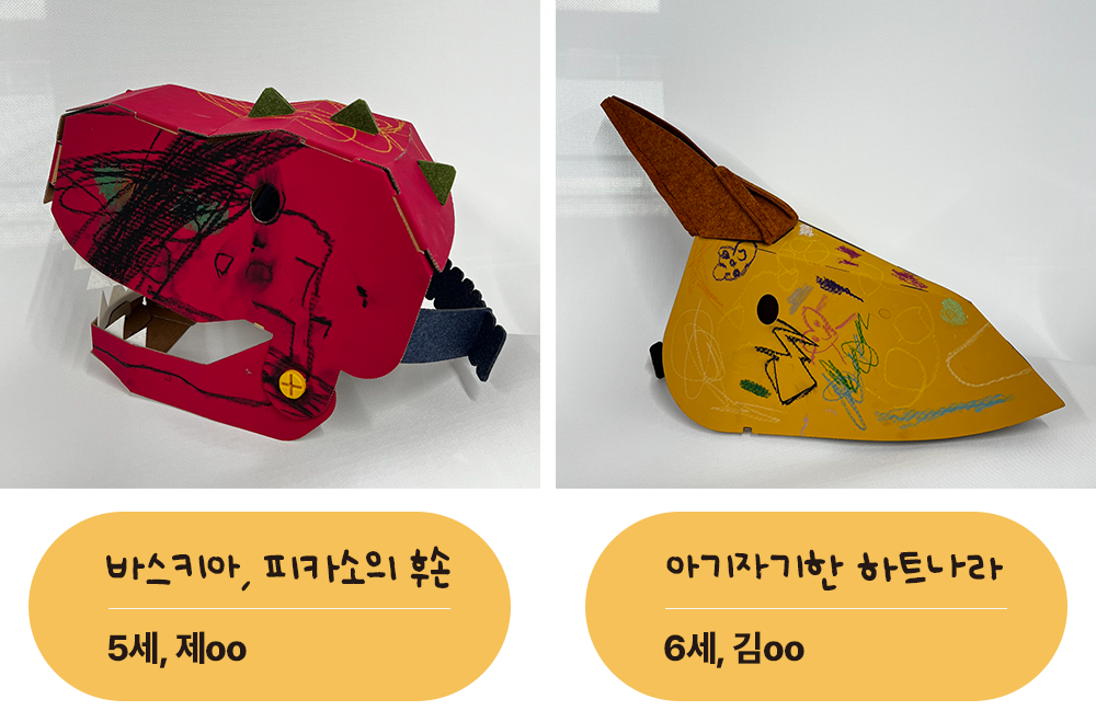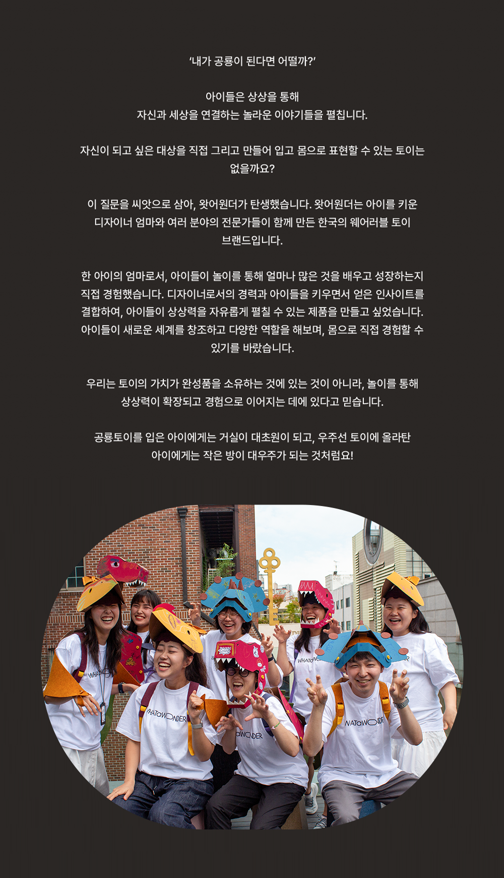 아이들이 충분히 놀고 나면, 헤드밴드와 몸통 부분의 행거 구멍을 이용해 벽 또는 행거 걸이에 걸어 보관해 주세요. 아이들이 공룡이 되고 싶을 때 언제든 찾아와서 입을 수 있게요! 혹은, 거실 한 곳에 근사한 작품처럼 전시해주셔도 좋아요. 훗날 진짜 갤러리에 우리 아이의 그림이 걸릴 지도 모르니까요!