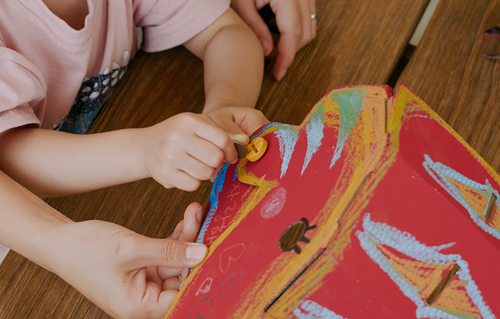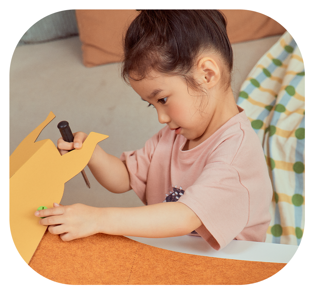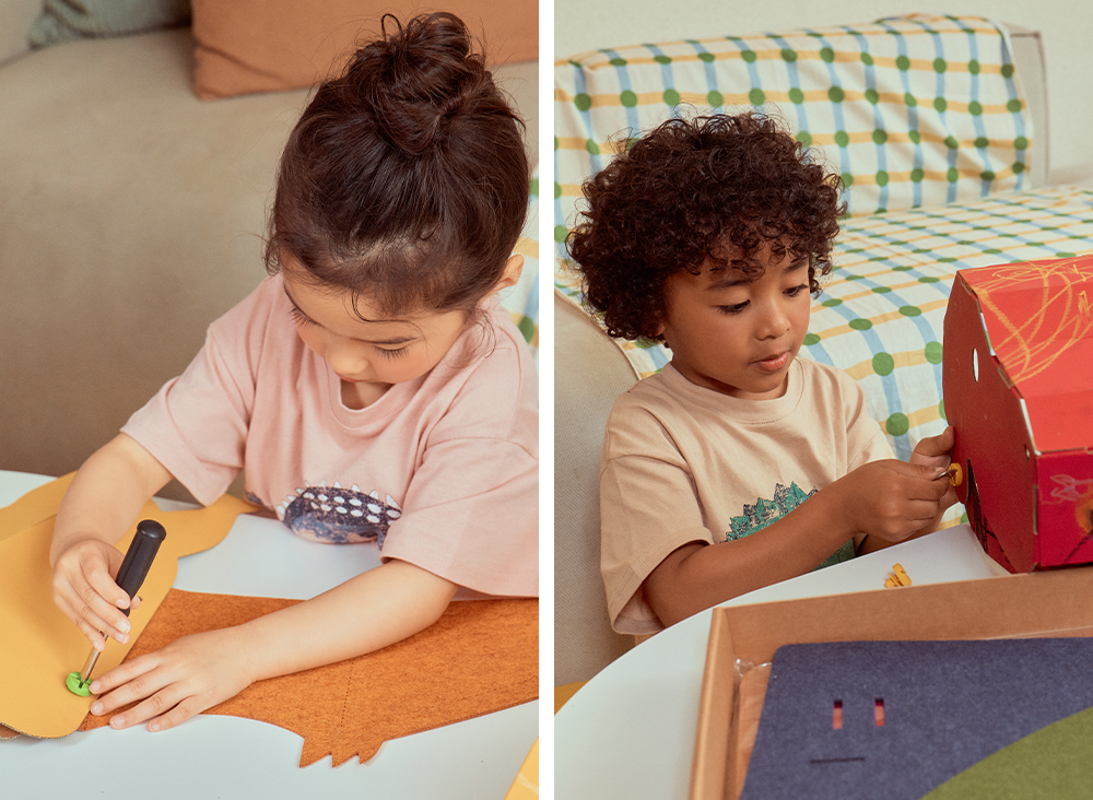5세의 아이들은 집중 시간이 비교적 짧으므로, 그림 그리기 / 나사 조이기와 같은 단순한 과정에 참여할 수 있도록 이끌어 주세요. 6세 이상의 아이들은, 성향과 능력에 따라 골판지 끼우기, 펠트 끼우기와 같이 좀 더 섬세한 작업도 해볼 수 있을 거예요.