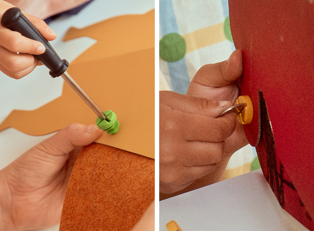 골판지와 펠트를 끼우고, 나사를 조이는 과정에서 아이들은 다양한 물성에 대해 경험할 수 있어요