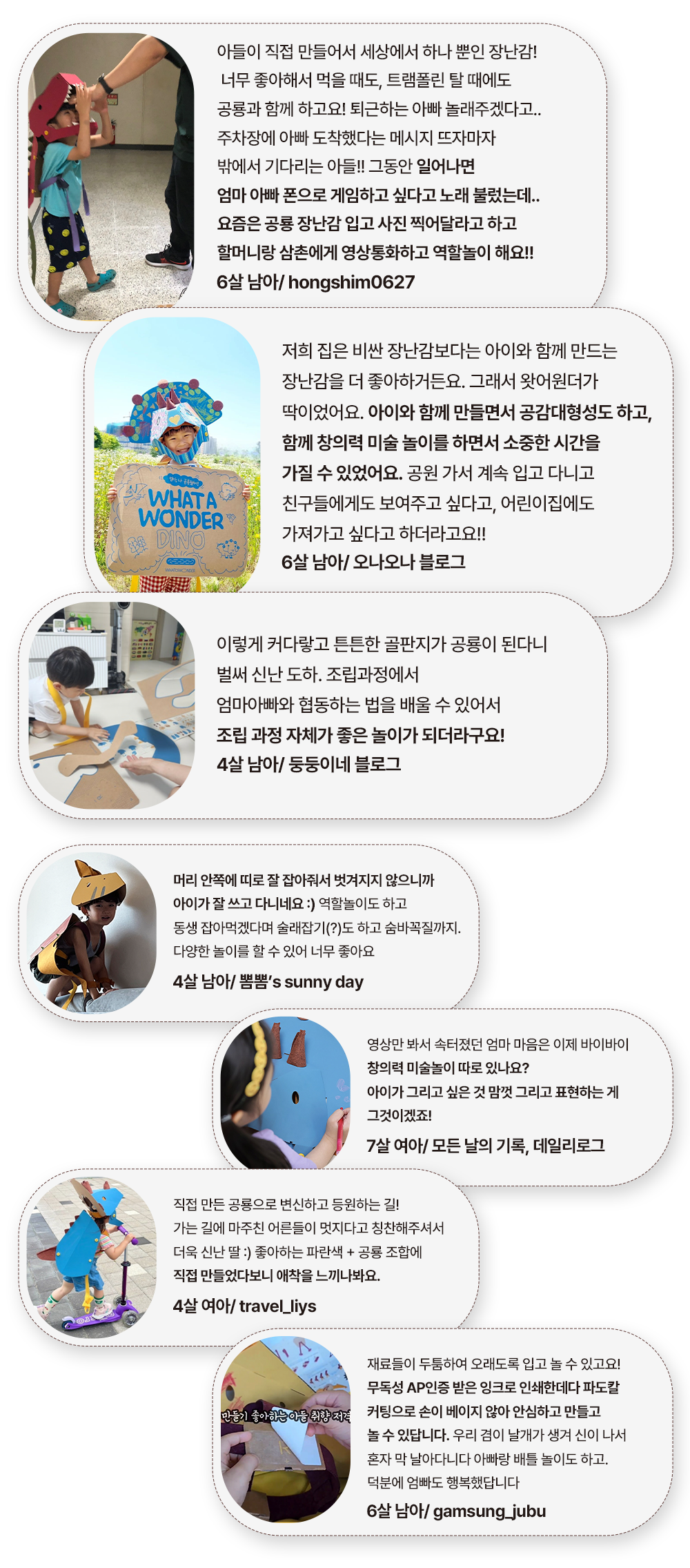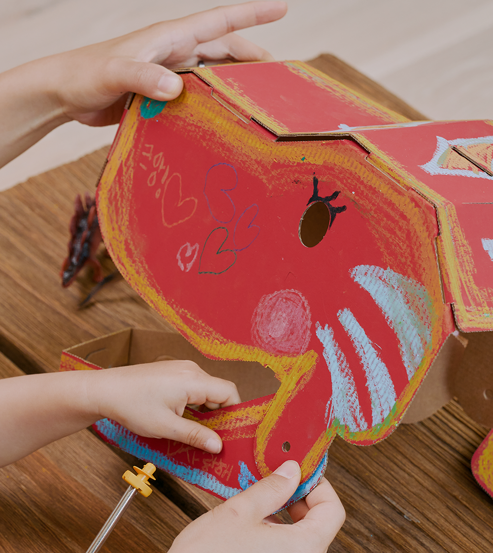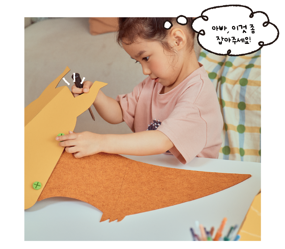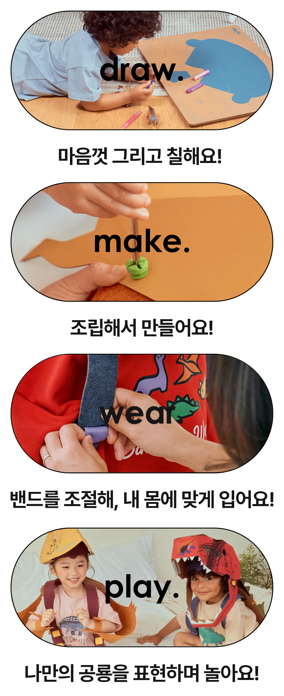 아이들이 마음껏 그림 그리고, 손으로 만들고, 또 만든 장난감을 입고 노는 경험을 통해 무럭무럭 자랄 수 있게 도와주세요. 단, 3세 미만 아이들은 나사 등의 작은 부품을 입에 넣을 수도 있기 때문에 주의가 필요합니다.