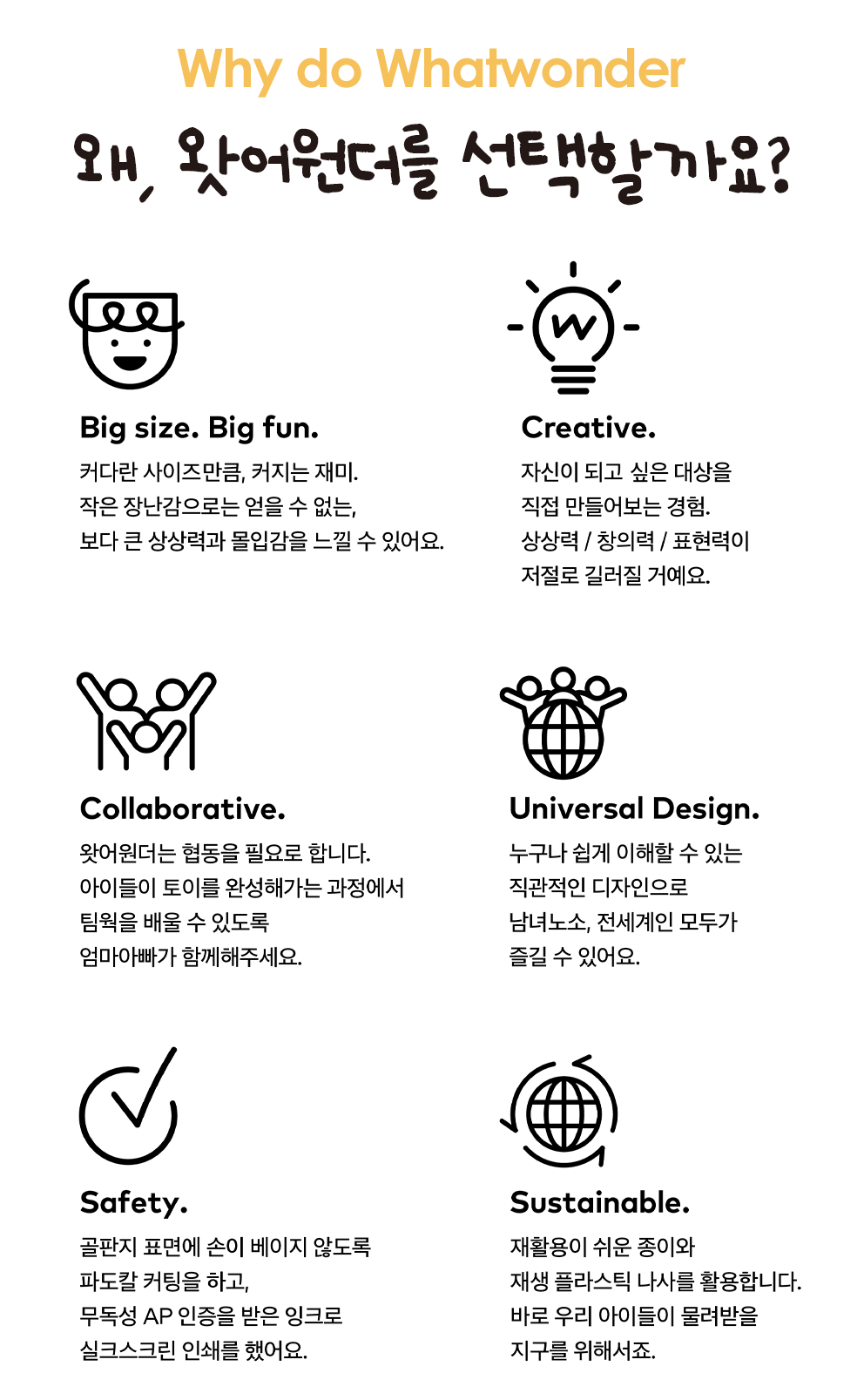 왓어원더는 아이들이 마음껏 그림 그리고 안전하게 입고 놀 수 있는, 골판지 보드로 만들어진 장난감입니다. 물과 큰 충격만 조심해 주시면 더 오래 갖고 놀 수 있어요.