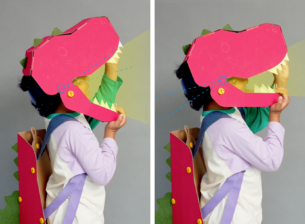 입을 열고 닫을 수 있는 디자인으로, 아이들이 착용했을 때 시야가 방해되지 않습니다. 원하는 만큼 각도를 조절해 더욱 재미있게 놀 수 있어요.