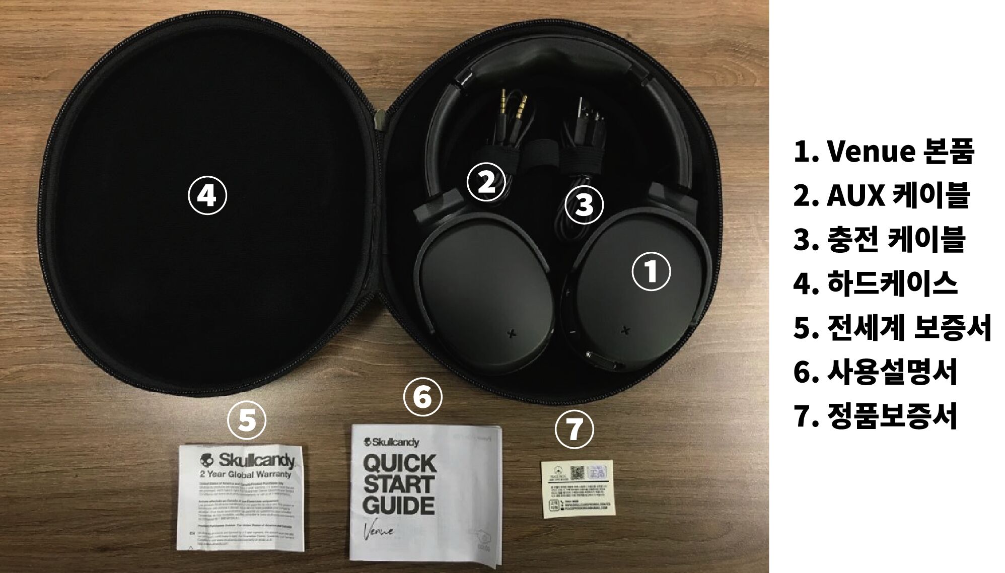 사용자의 출장, 여행에도 항상 안전하게 이동할 수 있도록, 스컬캔디 Venue 전용 하드케이스를 구성품 담았습니다. 그 외 전용 유선으로 이용하실 수 있도록 AUX케이블, 충전할 수 있도록 Micro USB 케이블과 사용설명서, 보증서를 함께 제공합니다.