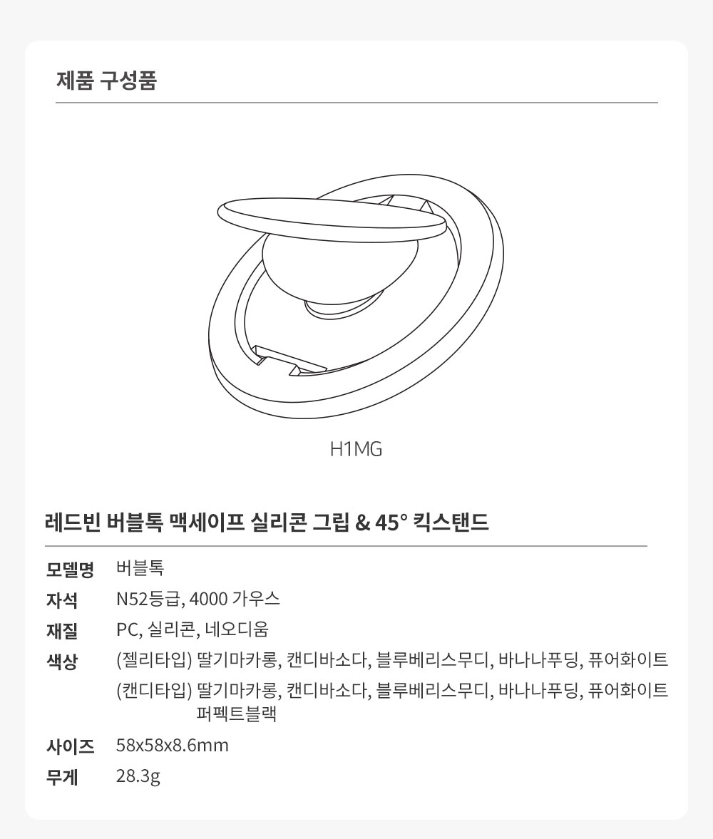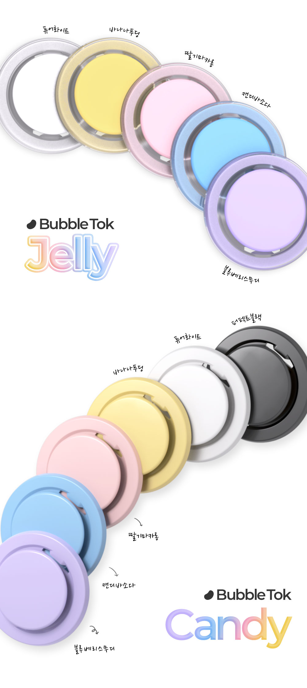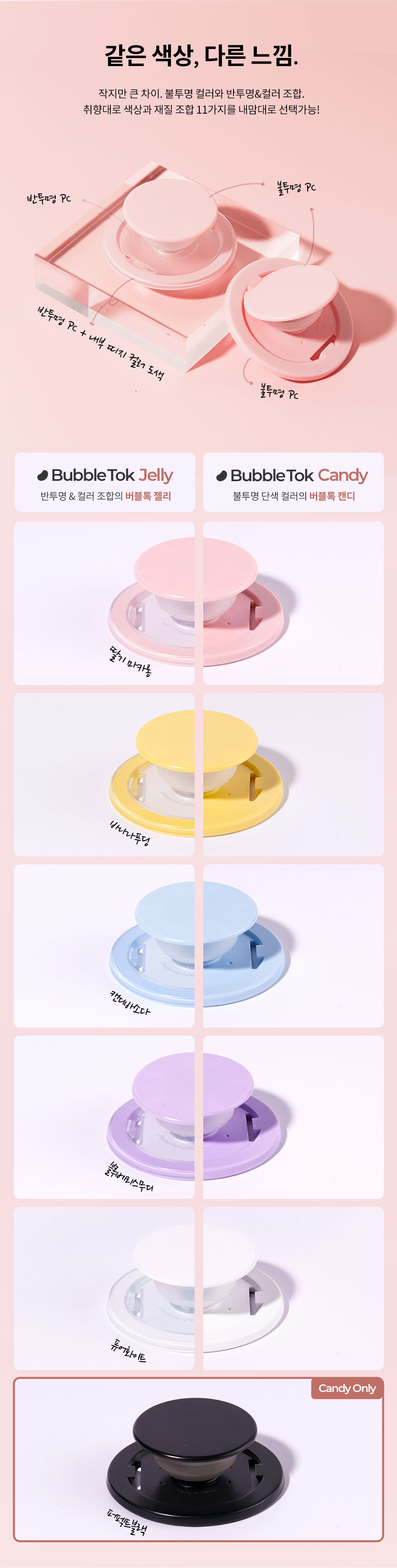 취향껏 색상과 재질을 골라보세요! 뒷면의 재질을 불투명 혹은 반투명 소재 중 어떤 것을 고르는지에 따라 핸드폰과의 조합 느낌이 색다르게 달라진답니다. 나만의 감각적인 버블톡을 완성해 보세요.