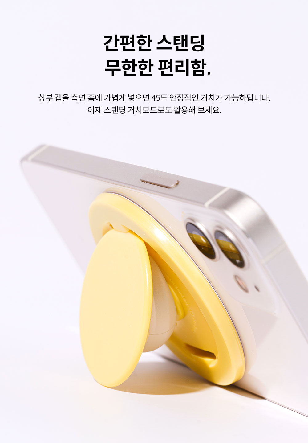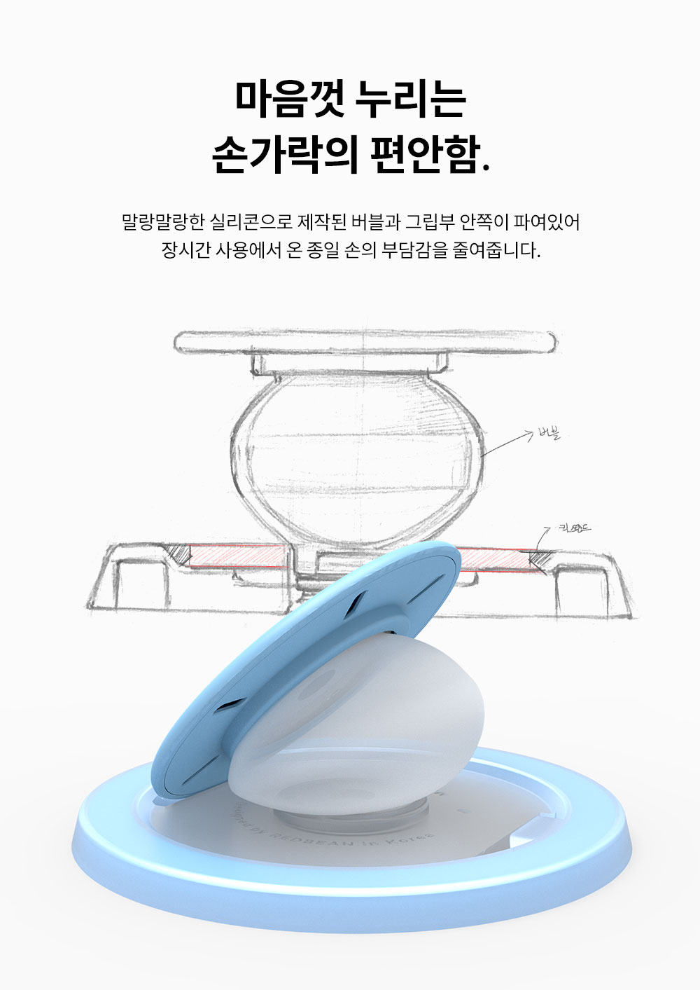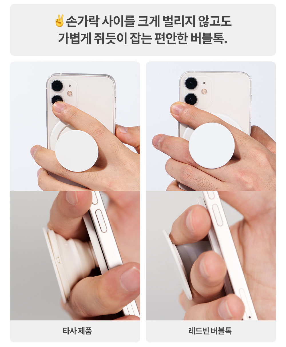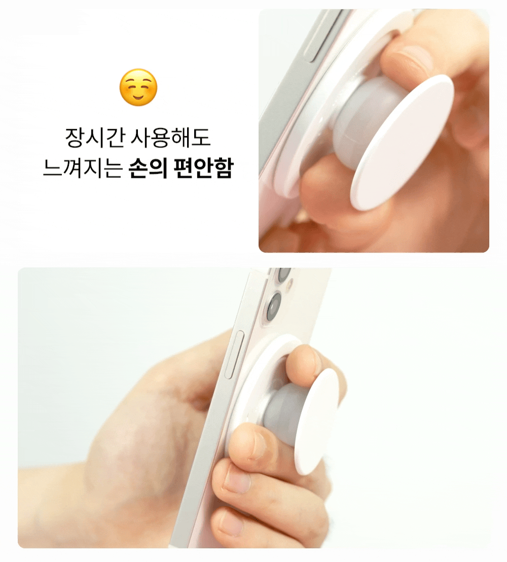 장시간 핸드폰을 들고 있어도 손가락이 편안한 이유, 바로 말랑한 실리콘으로 구현되는 각도 덕분입니다. 말랑말랑한 실리콘 버블로, 더욱 편안한 각도를 구현할 수 있죠.