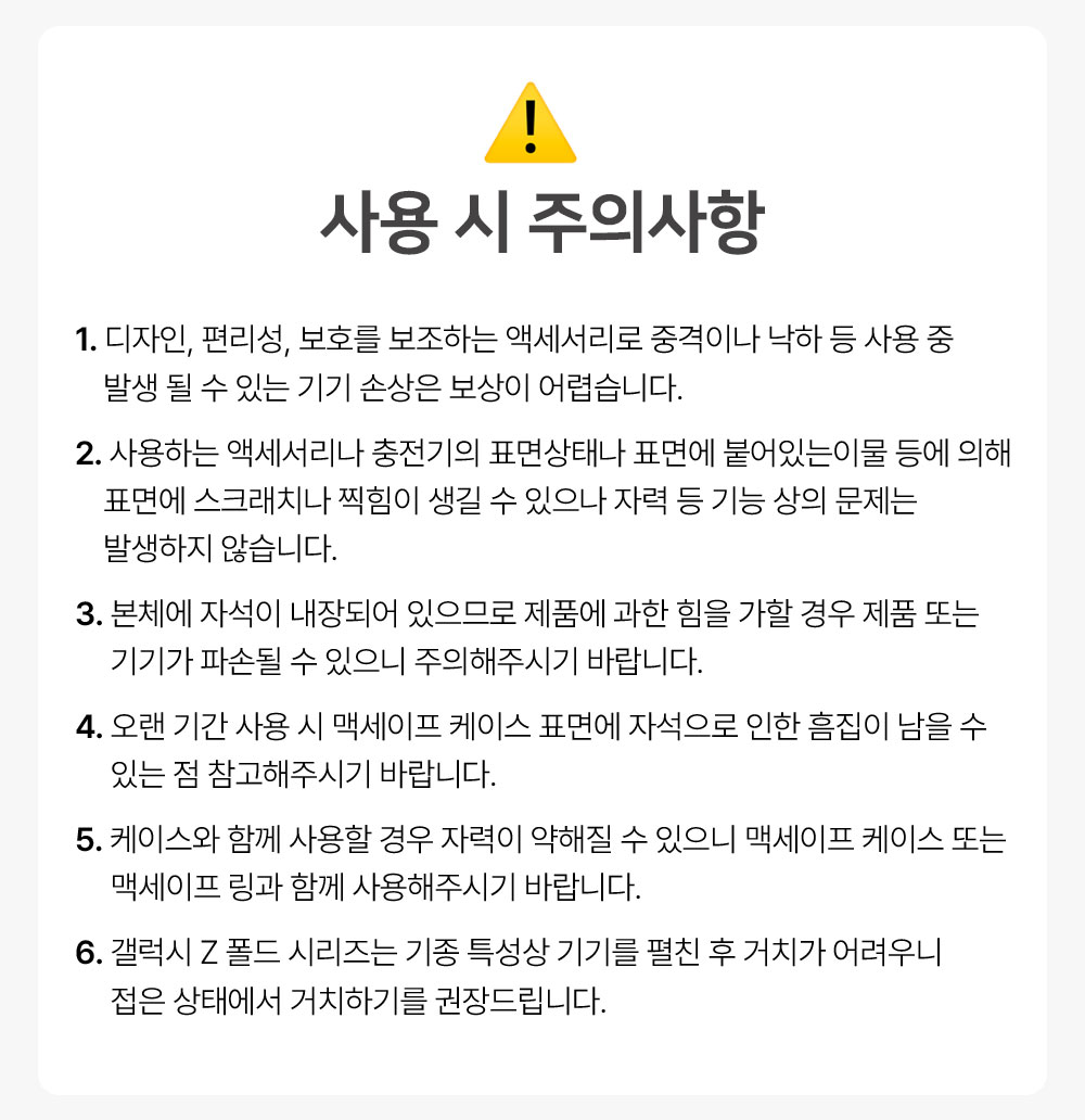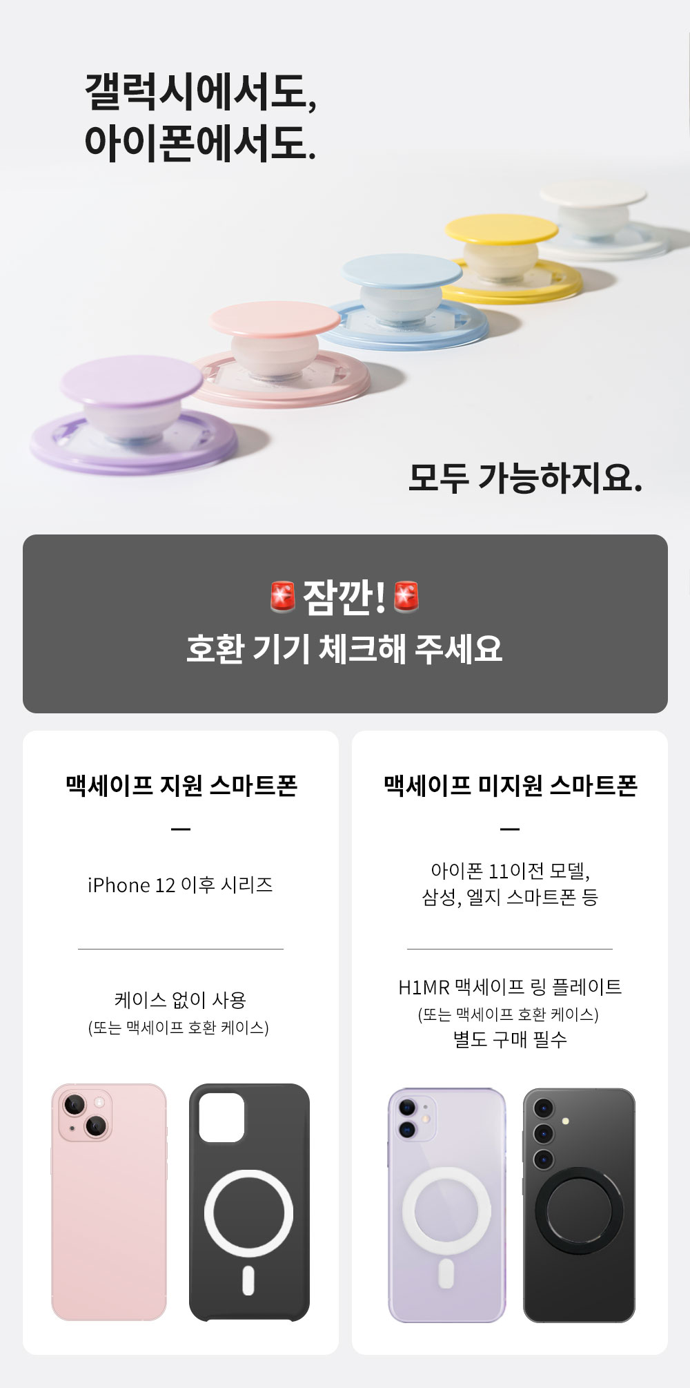 지원 가능한 모델을 확인해 보세요. 지원가능한 모델이 없더라도 걱정 NO. 맥세이프 링 플레이트를 함께 준비했습니다. 갤럭시 & 아이폰 모두 사용 가능해요!