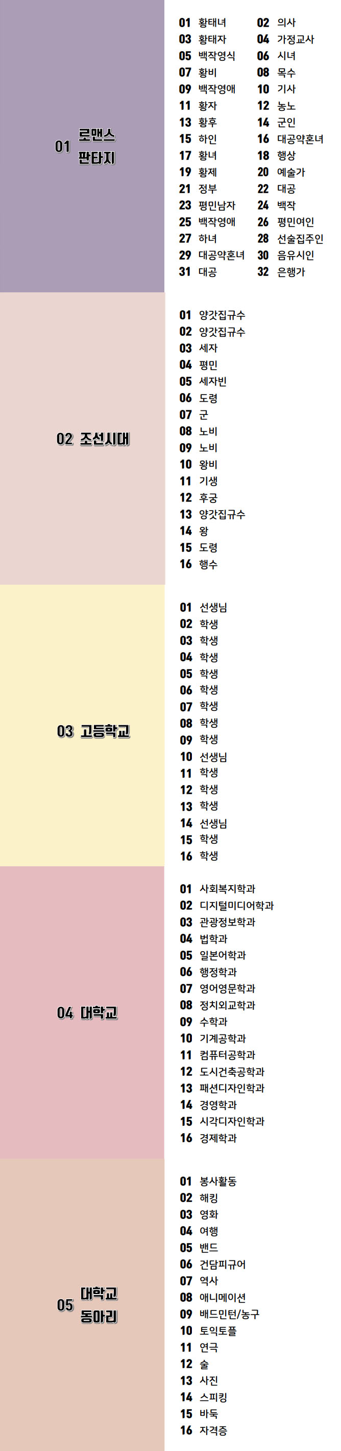 로맨스판타지, 조선시대, 현대의 다양한 캐릭터들을 소개하며,