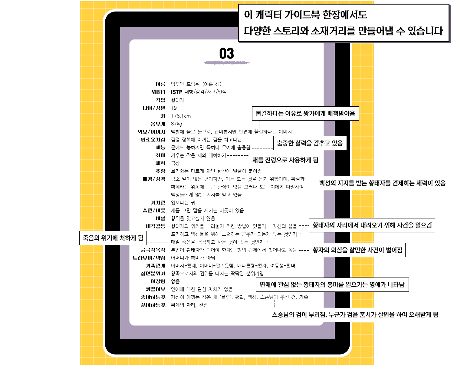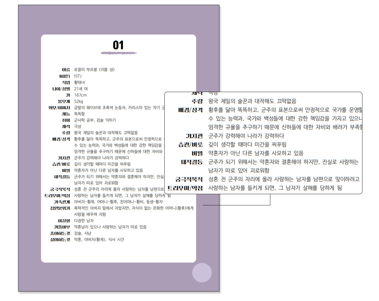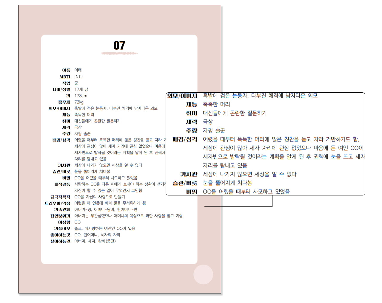 이름, 성격, 내적갈등, 비밀, 트라우마, 궁극적 목적... 다양한 설정들을 다채롭게 조합해볼 수 있어요