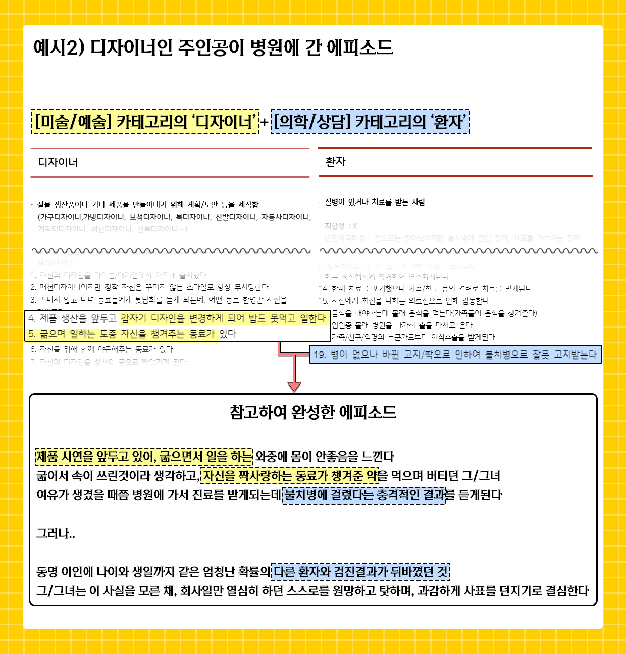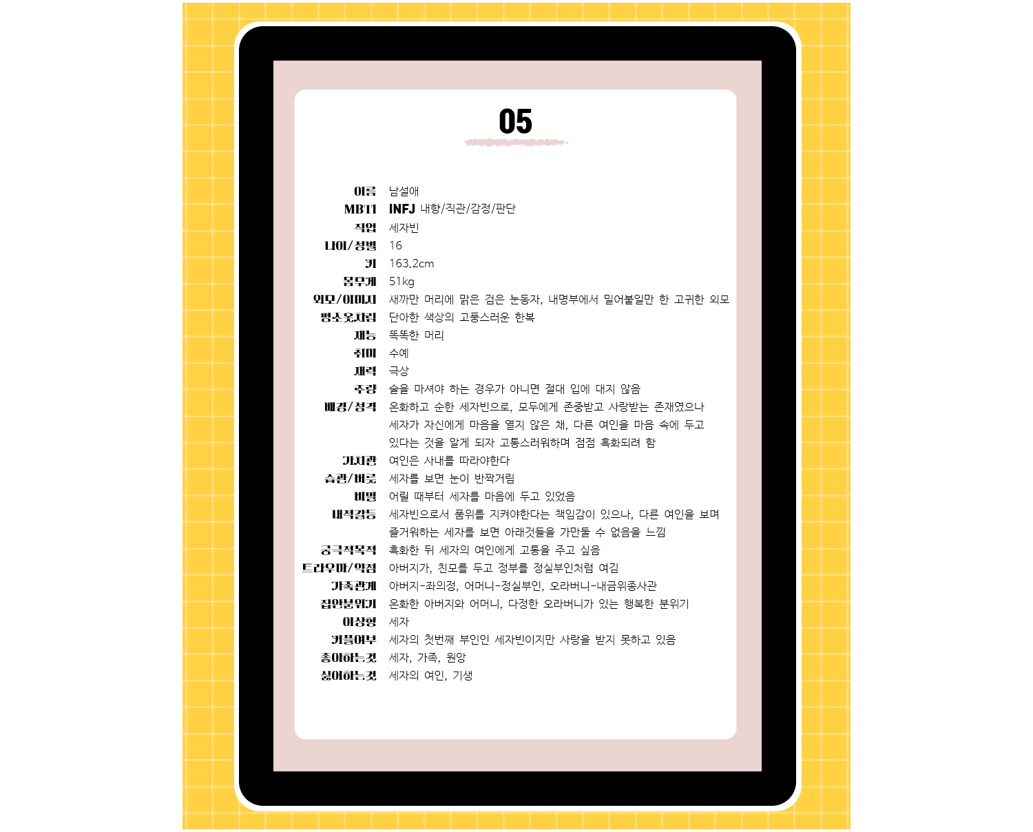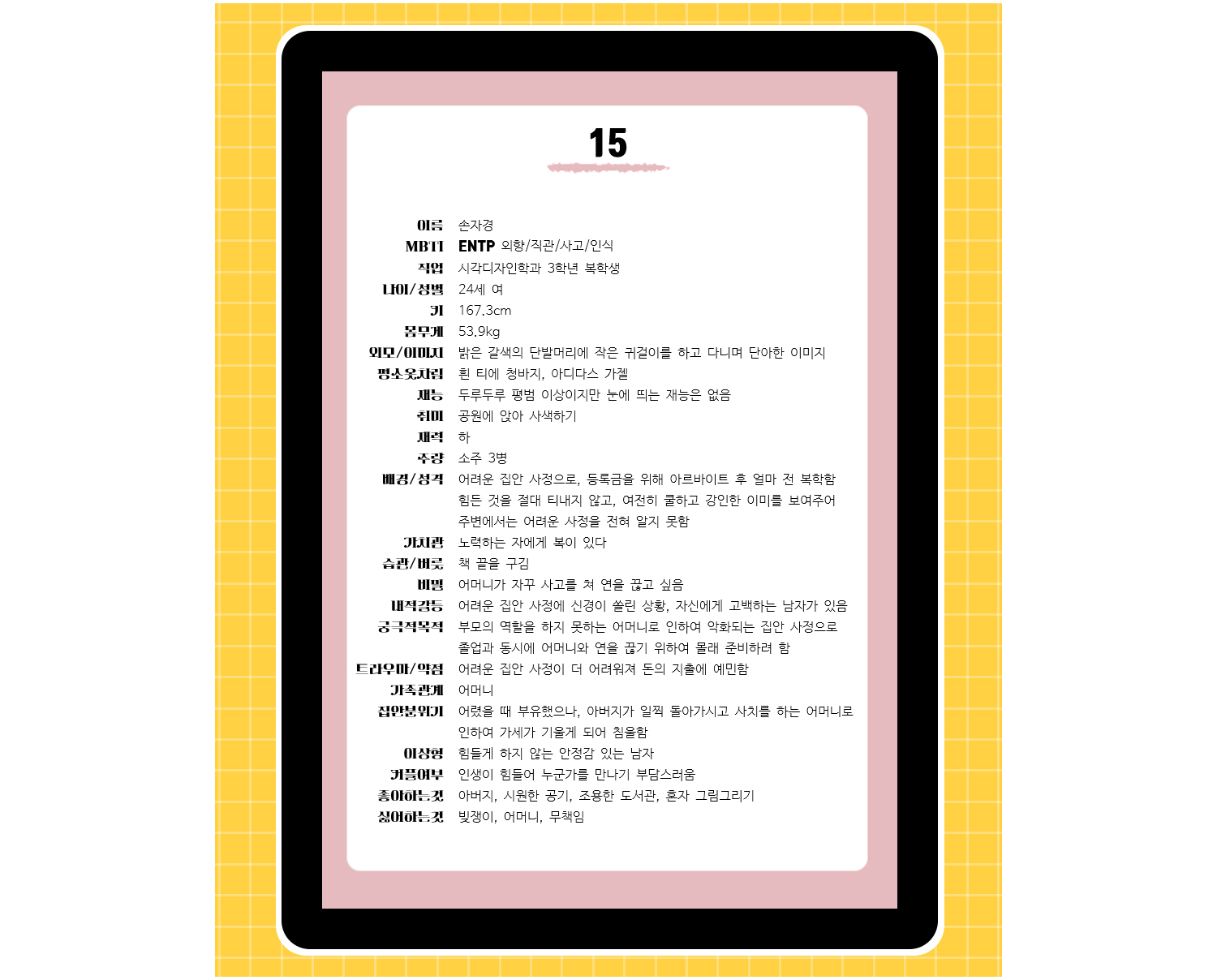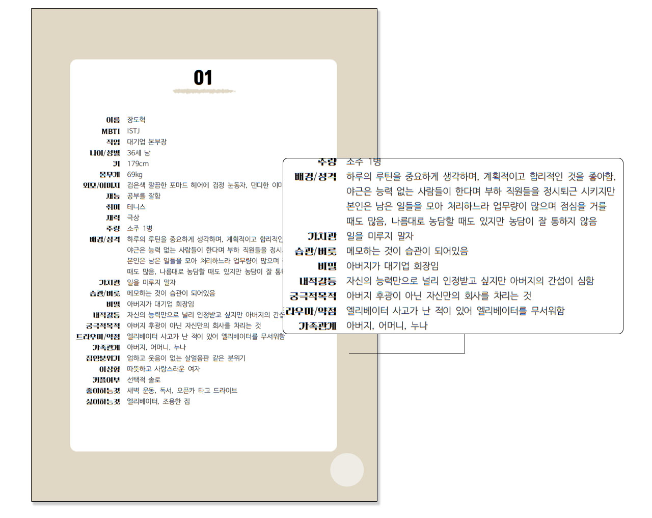 이름, 성격, 내적갈등, 비밀, 트라우마, 궁극적 목적... 다양한 설정들을 다채롭게 조합해볼 수 있어요
