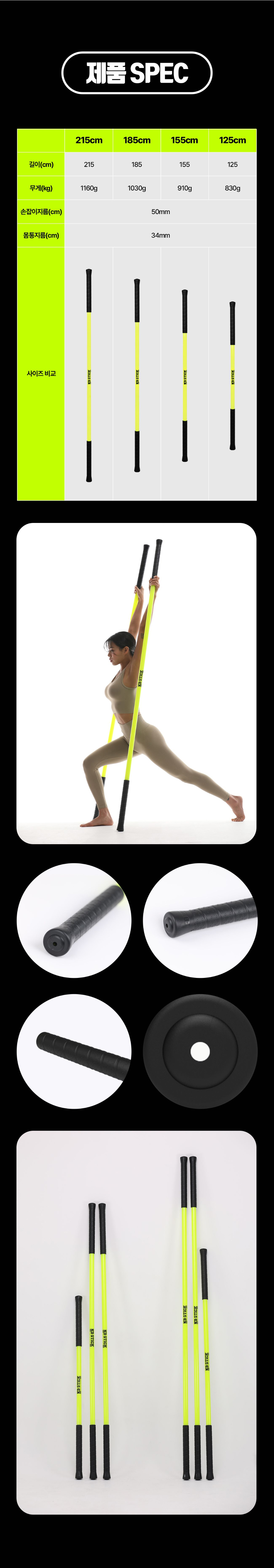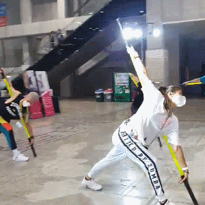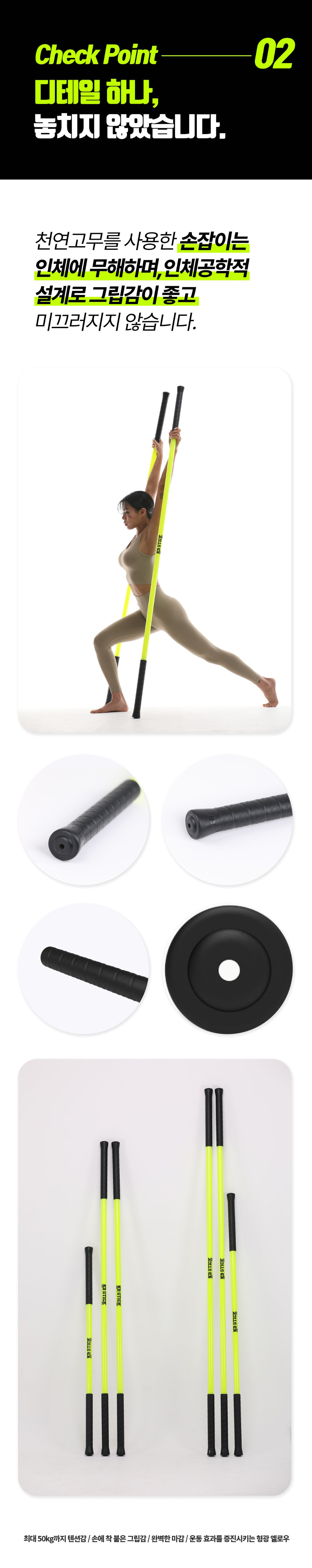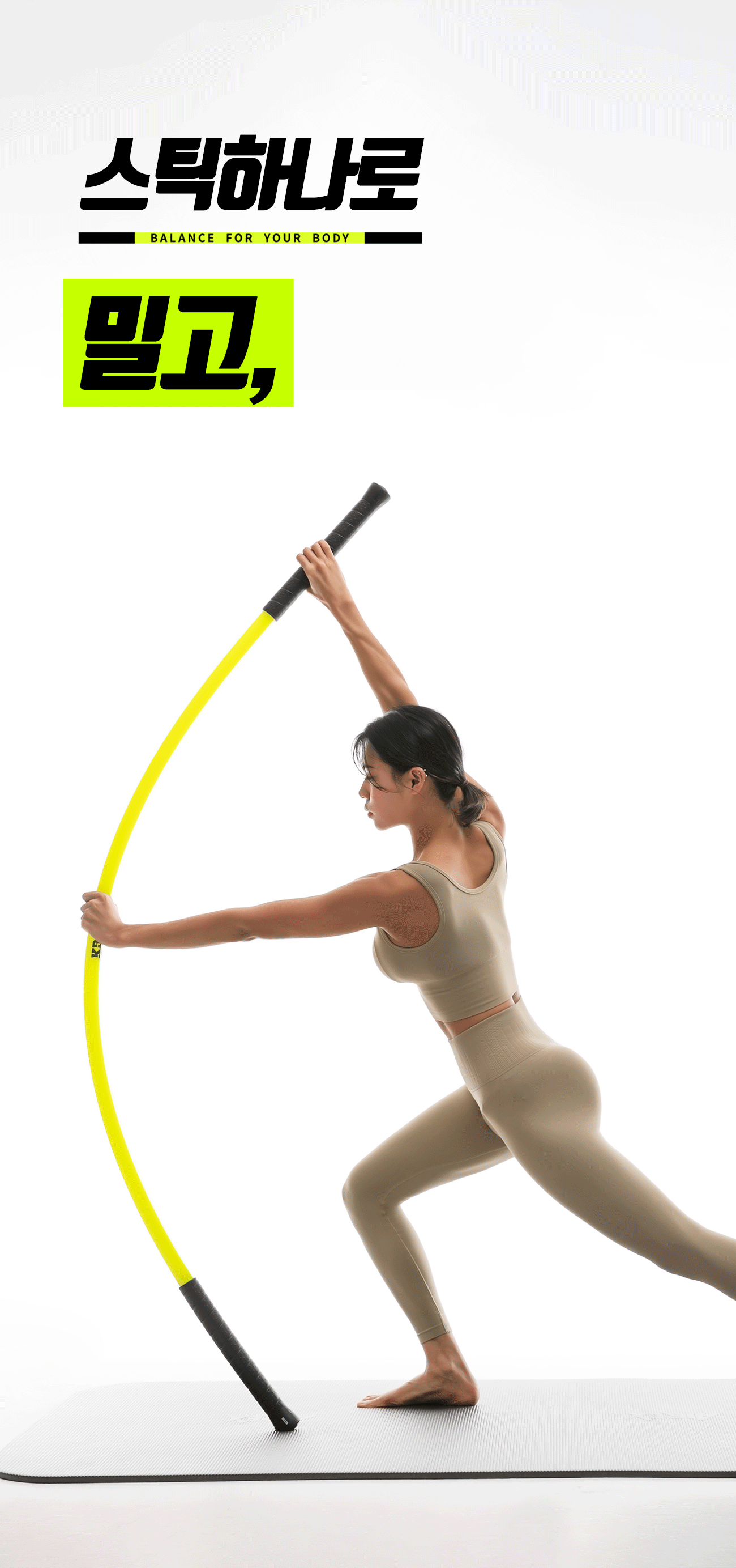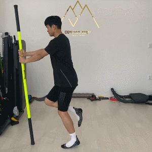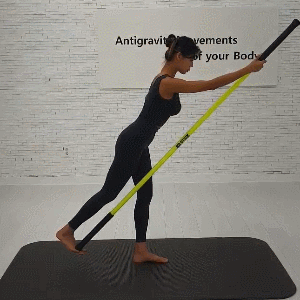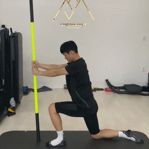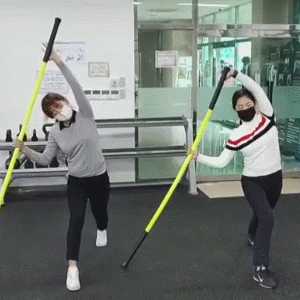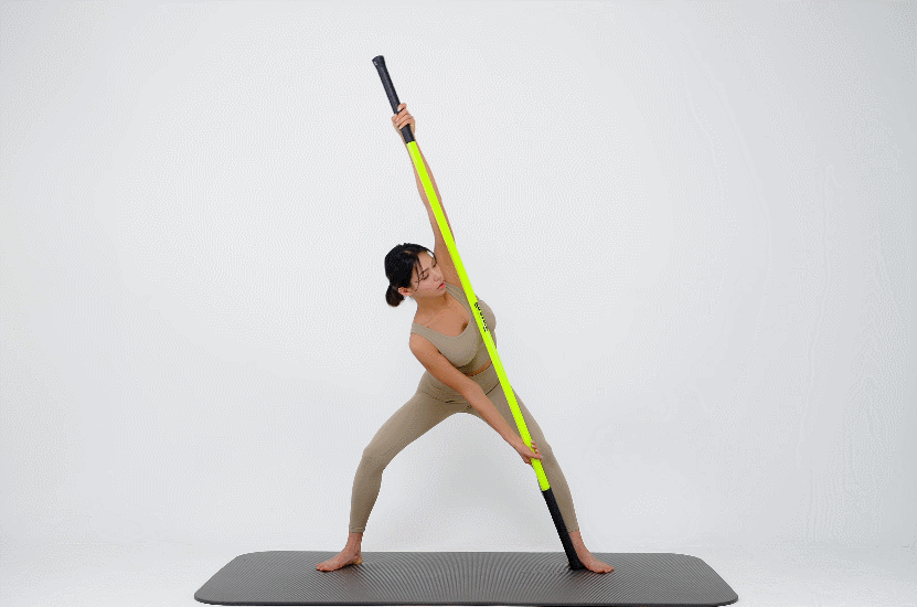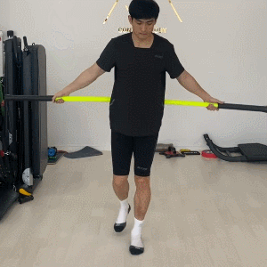 스틱 양 쪽을 잡고 몸을 길게 늘려보세요. (악력, 어깨 안정성, 힙 가동성, 발목 안정성이 좋아집니다!)