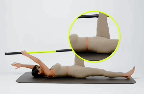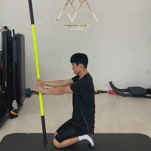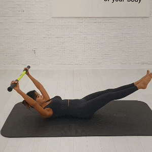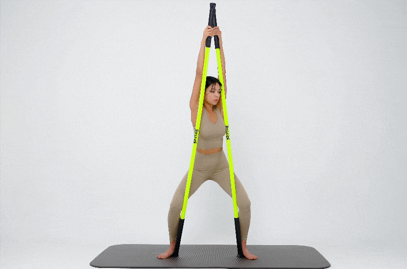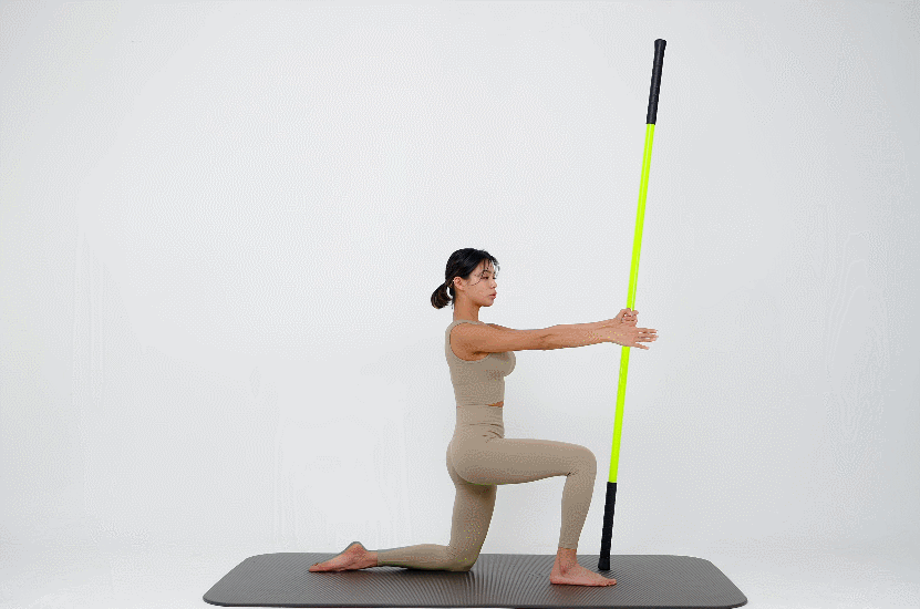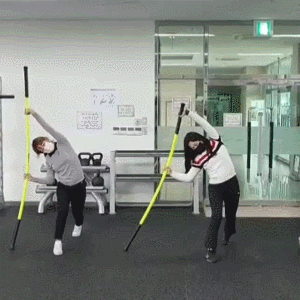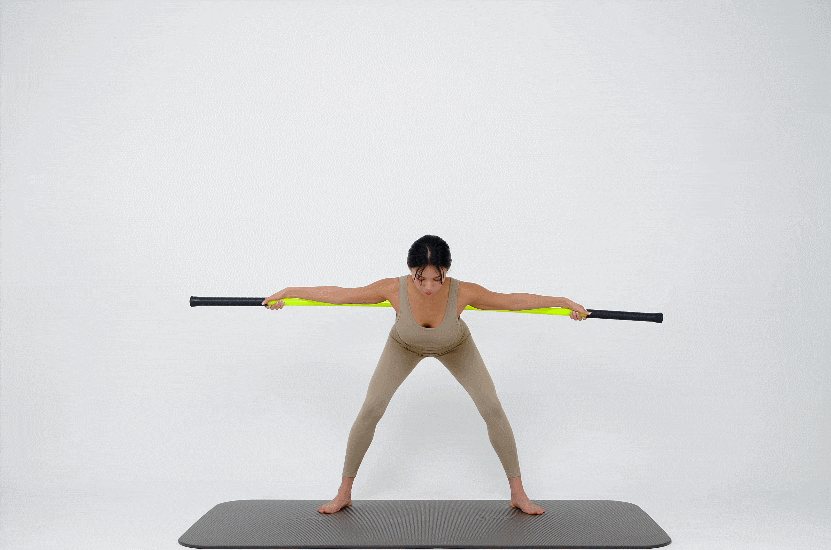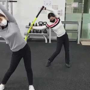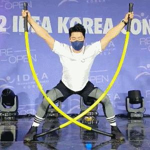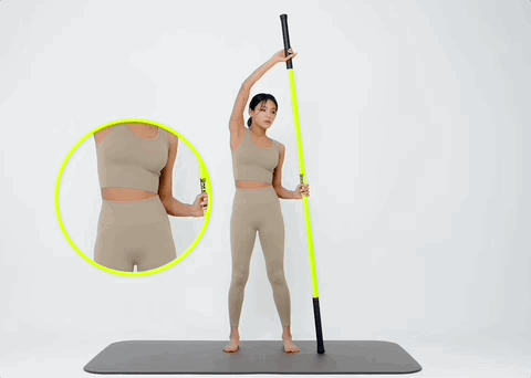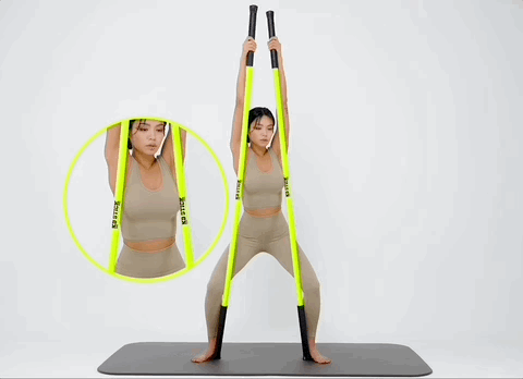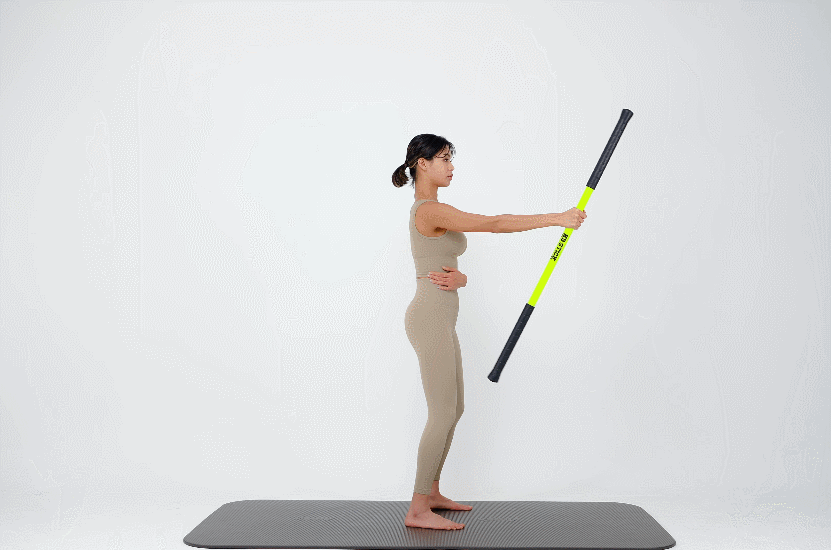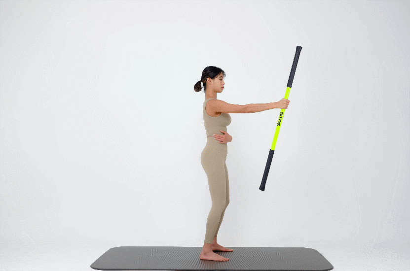 스틱 두개를 양 쪽으로 잡고 윗부분을 잡은 뒤 좌우로 트위스트 해주세요. (라운드 숄더 체형에게 추천해요!)