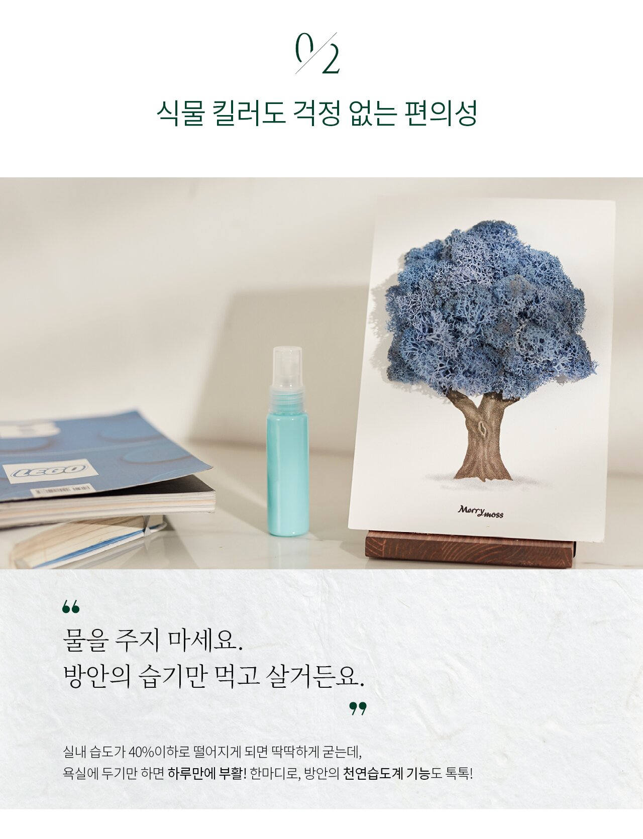 별도의 관리가 필요없습니다. 오히려 물을 주면 절대 안됩니다. 방안에 약간의 습기면 충분합니다. 걱정없이 그냥 두시면 됩니다. 천연습도계 역할을 하는 메리모스는 특별한 관리 없이도 이 상태로 10년 오래오래 유지합니다. 그야말로, 식물킬러가 사랑할 수 밖에 없는 똑똑한 반려식물이랍니다.