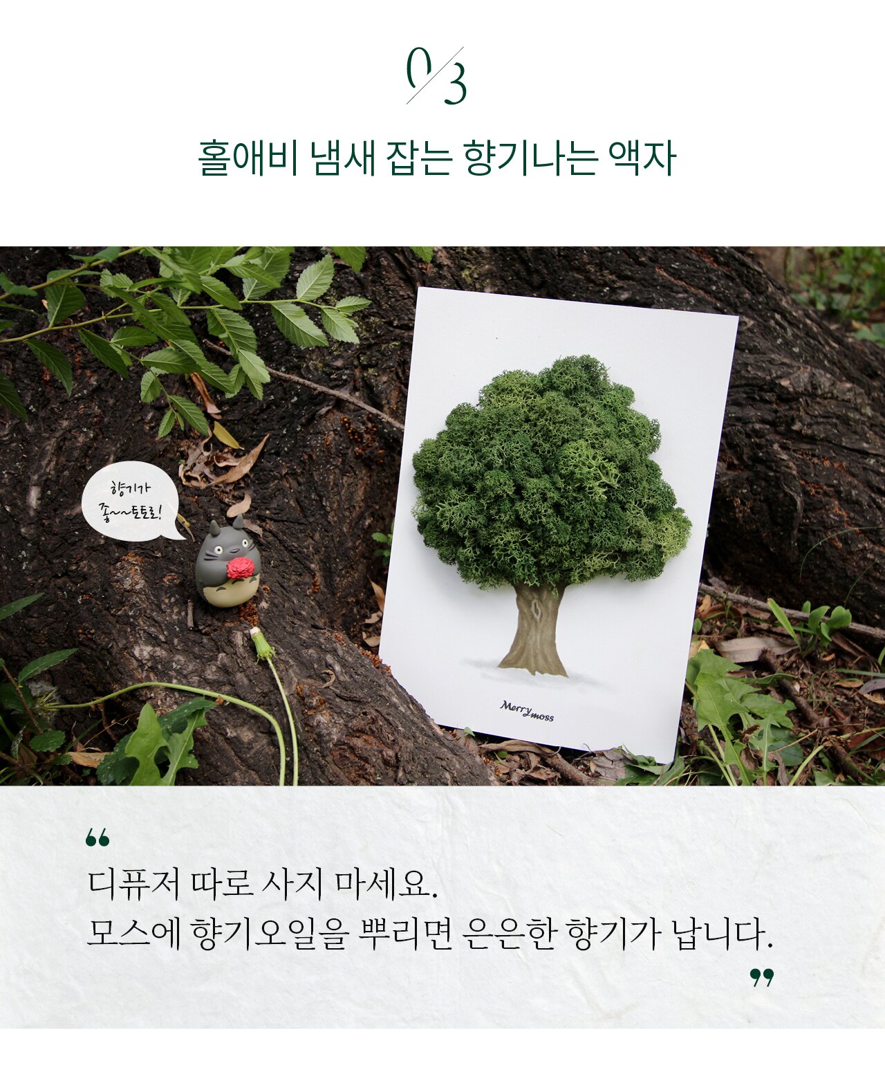 잘 아시듯이 디퓨저, 캔들은 사용후 바로 '소진'되는 특성 때문에 결국엔 버릴 수 밖에 없게 됩니다. 우리는 좀 더 오래오래 향기를 즐길 수 없을까요? 그래서 우리는 2년간의 향 연구, 인증 및 디자인 개발을 마치고 와디즈에서 최초,로 '천연이끼 액자 메리모스'가 세상에 나왔습니다.
