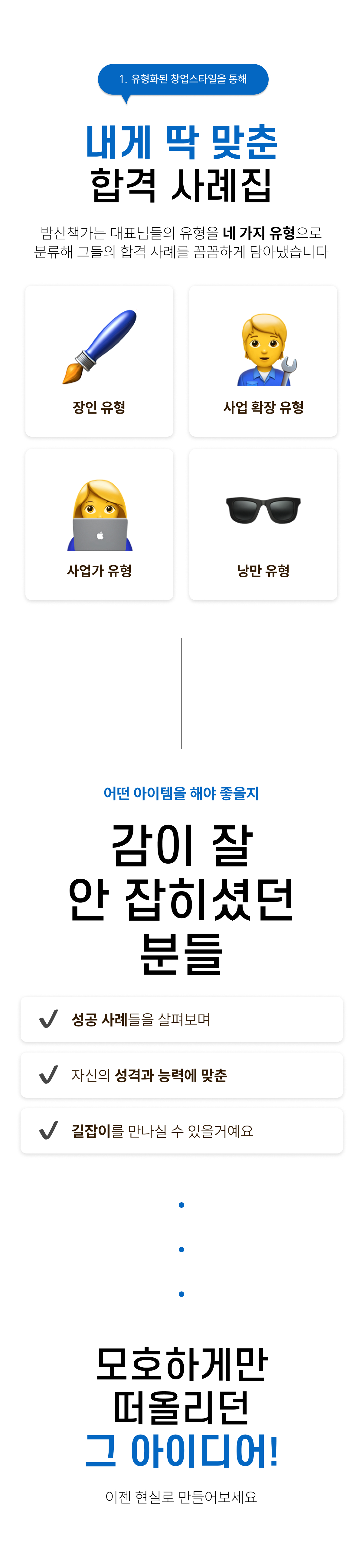 <누가 정부창업지원을 받는가?> - 국내 최초! 정부창업지원 합격 사례집 에서 확인해 보시면 좋을 것 같습니다.