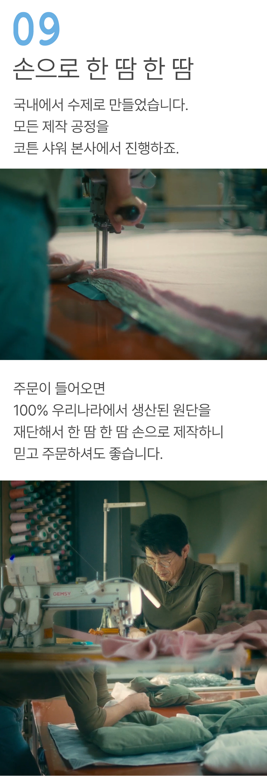 원자재값이 더 올라도, 외국에서 수집된 저렴한 원단이 유혹을 해도, 코튼샤워는 이 순면 원단과 기능성 항균 원단을 포기하지 않을 예정입니다. 땀 흡수 잘되고 피부에 좋은 국내산 원단이기 때문이죠!
