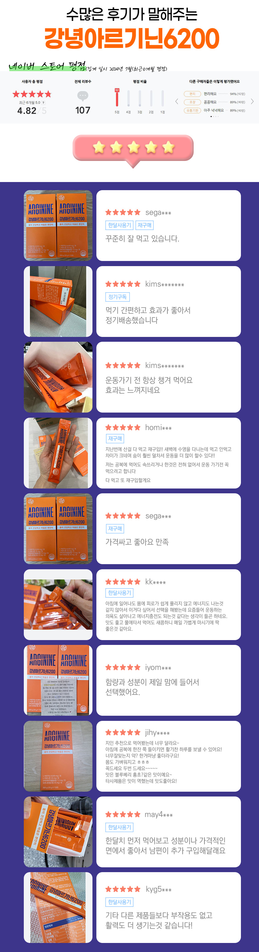 - 2022년 10월 강녕아르기닌은 처음 세상에 나왔습니다. 1년여가량 판매하면서 고객들의 후기와 만족도를 꾸준히 조사해왔으며 해당 조사내용을 바탕으로 개선상품을 계획하여 제작했습니다.